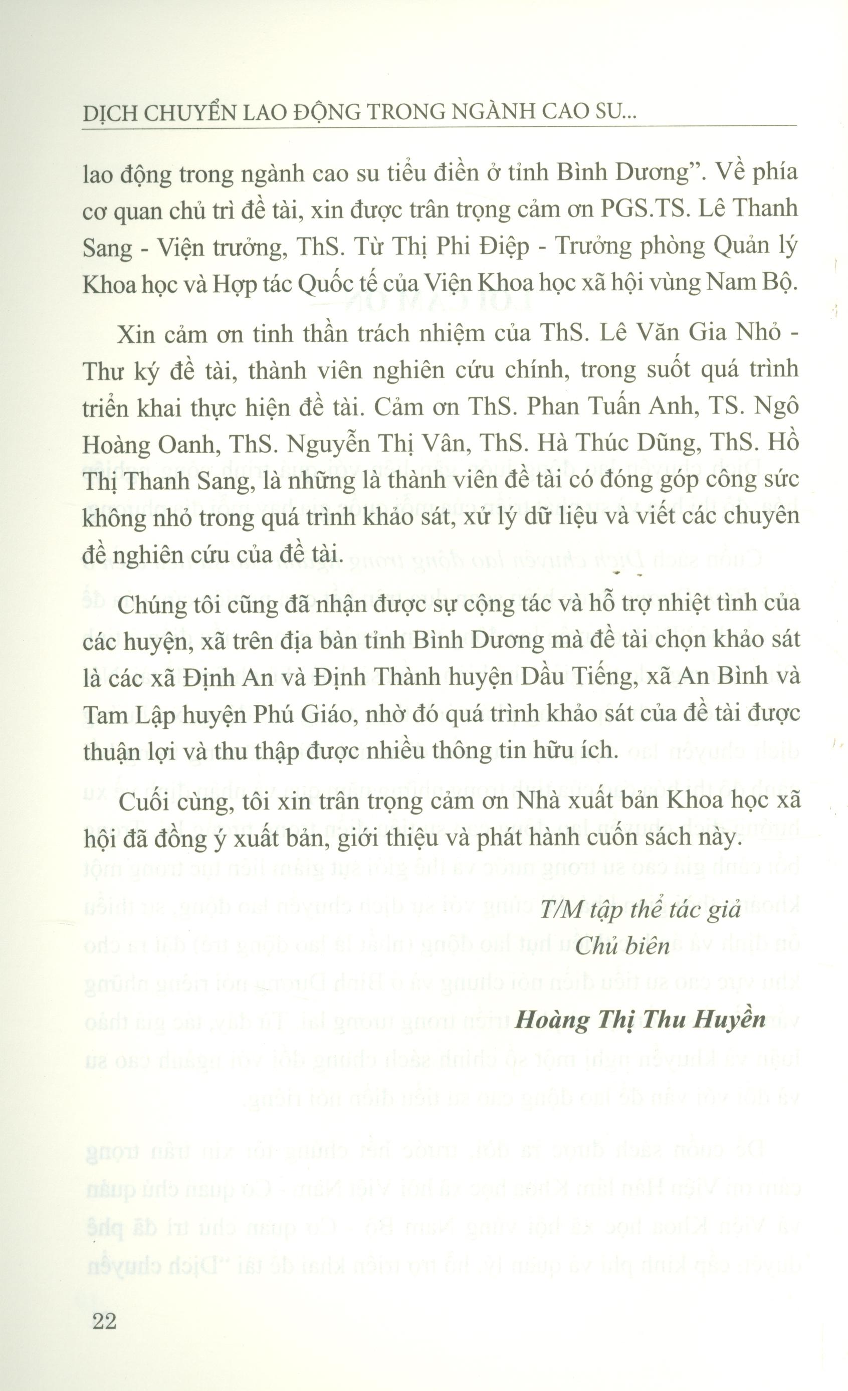 Dịch chuyển lao động luôn gắn liền với quá trình công nghiệp hóa, đô thị hóa và sự phát triển của mỗi quốc gia hay mỗi địa phương. Nội dung cuốn sách cho thấy cùng với tình trạng giá cao su sụt giảm liên tục trong thời gian qua thì sự dịch chuyển lao động đã gây ra tính thiếu ổn định và tạo áp lực thiếu hụt lao động (nhất là lao động trẻ) đối với ngành cao su tiểu điền. Điều này đặt ra cho khu vực cao su tiểu điền nói chung và Bình Dương nói riêng những vấn đề về sự tồn tại và phát triển trong tương lai. Đặc biệt, cuốn sách tập trung phản ánh thực trạng lao động, xu hướng dịch chuyển lao động cao su tiểu điền tại tỉnh Bình Dương trong bối cảnh đô thị hóa cao của tỉnh trong những năm qua và nhận định về xu hướng dịch chuyển lao động cao su tiểu điền trong tương lai. Từ đây, tác giả thảo luận những chính sách chung đối với ngành cao su, đồng thời khuyến nghị chính sách riêng đối với lao động cao su tiểu điền và đề xuất một số giải pháp quản trị lao động cao su tiểu điền.