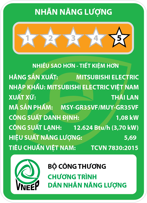 - Hiệu suất năng lượng :5,69(TCVN 7830:2015)