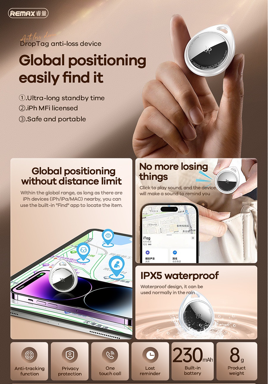 ✨Định Vị Remax DropTag RT-G2302, Định Vị Không Giới Hạn Khoảng Cách + Tặng pin + dây đeo - Hàng chính hãng