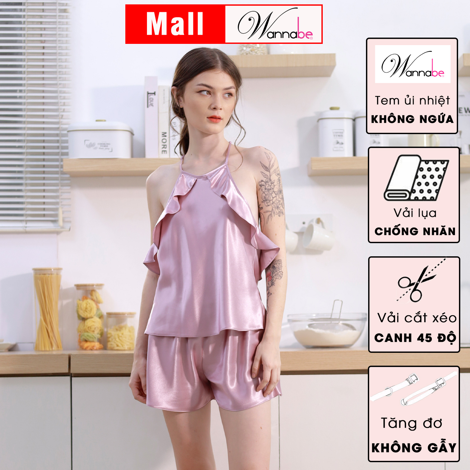 Đồ bộ mặc phi lụa cao cấp WANNABE BSS38 bộ sọt 2 dây cúp 2 lớp tạo độ phồng cúp ngực nữ tính trẻ trung năng động Đồ bộ mặc nhà phi lụa cao cấp