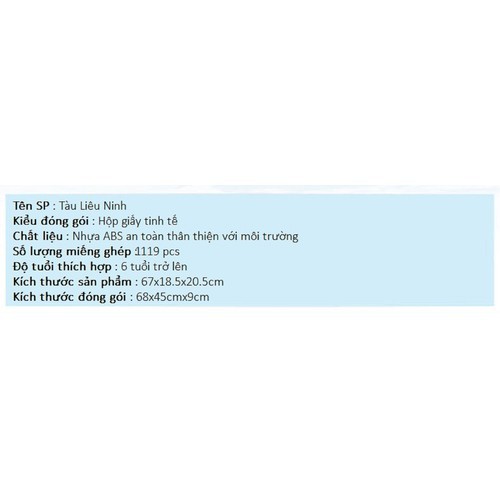 Đồ Chơi Lắp Ráp Tàu Mẫu Hạm Liêu Ninh   Kiểu đóng gói: Hộp giấy tinh tế   Chất liệu: Nhựa ABS an toàn thân thiện với môi trường   Số lượng miếng ghép: 119 pcs   Độ tuổi thích hợp: 6 tuổi trở lên   Kích thước sản phẩm: 67x18.5x20.5cm   Kích thước đóng gói : 68x45cmx9cm   Bộ Lắp ráp đồ chơi tàu chiến tranh bay 6450 nằm trong seri lắp ráp mô hình MILITARY MARTIME gồm các mô hình chủ đề liên quan đến hàng hải : tàu chiến hạm, tàu chiến sân bay , tàu đổ bộ , tàu khu trục tên lửa , tàu chiến ngầ  Các chi tiết nhựa được gia công tỉ mỉ chắc chắn, miếng ghép nhẵn mịn , an toàn cho bé. Mô hình với nhiều chi tiết sát với hình ảnh thật , rèn luyện năng lực cảm nhận , trí sáng tạo và tưởng tượng của bé , chắc chắn bé nhà bạn sẽ thích mê cho xem.   Đặc điểm nổi bật :