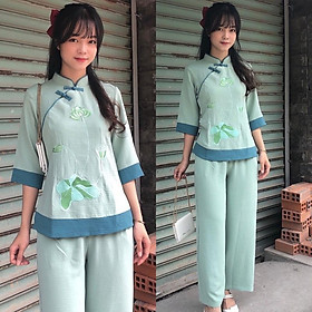 ✨Đồ Lam Đi Chùa # Sẫm 2Nút Hoa Thêu Phối Vải Đũi