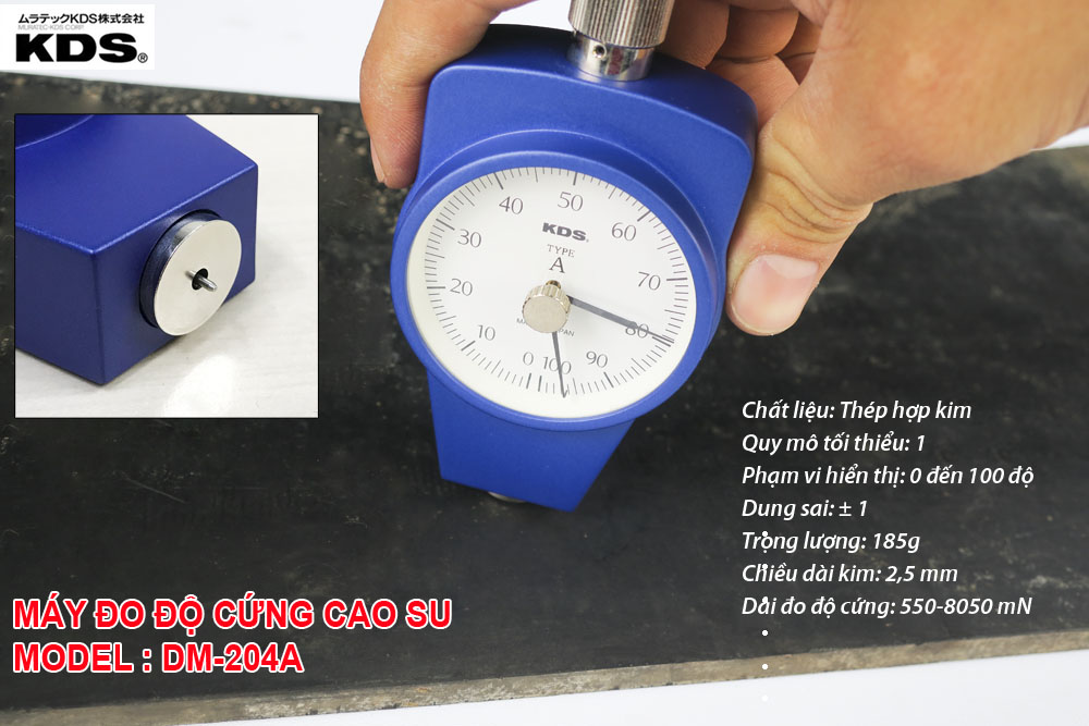 - Đồng hồ đo độ cứng cao su KDS DM-204A làm biến dạng bề mặt mẫu cần đo bằng cách ấn một vết lõm trên bề mặt mẫu bởi lực của lò xo, và độ cứng được đo dựa vào mức lún của vết lõm. Khi độ cân bằng được giữ giữa lực đàn hồi của mẫu và lực của lò xo trong máy.
