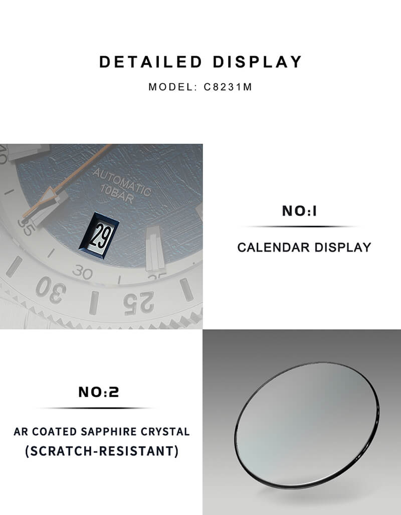 Các tính năng Thiết kế vỏ mỏng, mặt đồng hồ phẳng cùng các vạch chỉ giờ giúp chiếc đồng hồ này trông vô cùng đơn giản và nam tính. Cùng các tông màu xanh hải