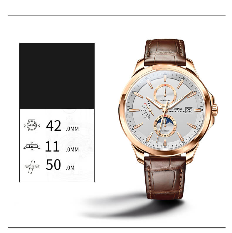 Nhãn hiệu LOBINNI Mã sản phẩm No.16053-9 Giới tính Nam Kiểu máy Automatic (Máy Cơ) Đường kính mặt 43 mm Độ dày 11,5 mm Chất liệu vỏ Thép không gỉ 316L Chất liệu dây Dây da cao cấp Chất liệu mặt kính Sapphire Crystal