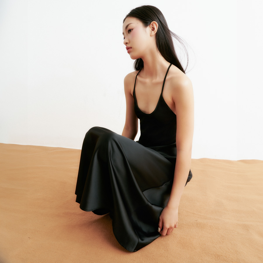 Mua tại TiktokTHÔNG TIN SẢN PHẨM [CHÍNH HÃNG] Đầm lụa midi hở lưng nữ đen D0388