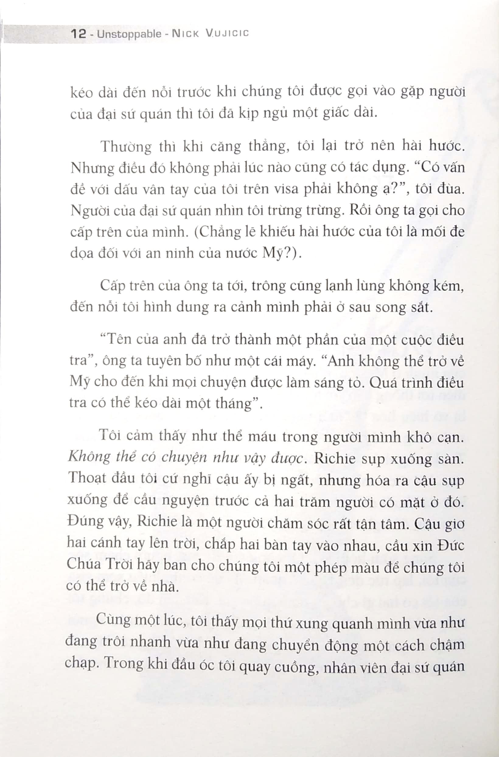 Nhìn ảnh của tôi trên bìa sách, các bạn có thể biết tôi sinh ra không có chân, không có tay. Điều mà các bạn không thể nhìn thấy nhưng có thể cảm nhận được là sự khuyết thiếu tứ chi này không thể ngăn cản tôi tận hưởng những chuyến phiêu lưu thú vị, không thể ngăn cản tôi vươn tới một sự nghiệp đầy ý nghĩa và mãn nguyện, càng không thể cản trở tôi có được những mối quan hệ đầy tình yêu thương.