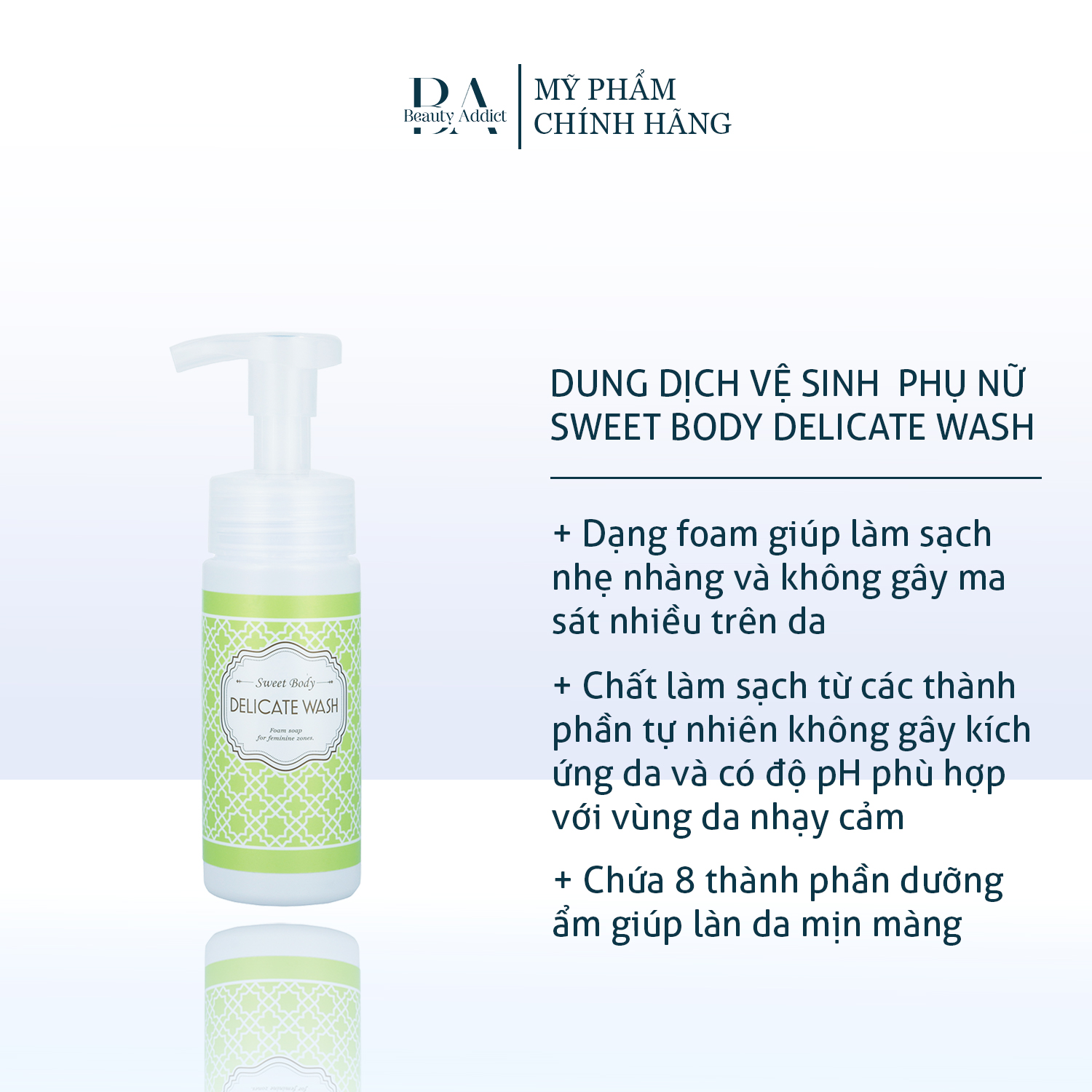 - Không cồn, không paraben, tính axit yếu giúp cân bằng độ pH không gây kích ứng cho vùng da nhạy cảm. Sweet Body Delicate Wash đem lại cảm giác dịu êm và mềm mịn khi sử dụng, không chỉ sử dụng cho chị em phụ nữ mà cánh mày râu cũng có thể sử dụng sản phẩm này để chăm sóc cá nhân tốt hơn! HDSD: Cho một lượng sản phẩm vừa đủ ra lòng bàn tay, nhẹ nhàng làm sạch nơi cần thiết. Rửa sạch với nước và lau khô trước khi mặc quần áo. Lưu ý: Dung dịch vệ sinh cần thiết nhưng không nên lạm dụng. Với những ai đang bị các vấn đề như ngứa, mùi hôi, khô ráp và khó chịu thì có thể sử dụng mỗi ngày 1-2 lần đến khi giảm triệu chứng. Với những ai không bị các triệu chứng trên mà chỉ có nhu cầu làm sạch thông thường có thể sử dụng mỗi ngày 1 lần hoặc xen kẽ cách ngày.