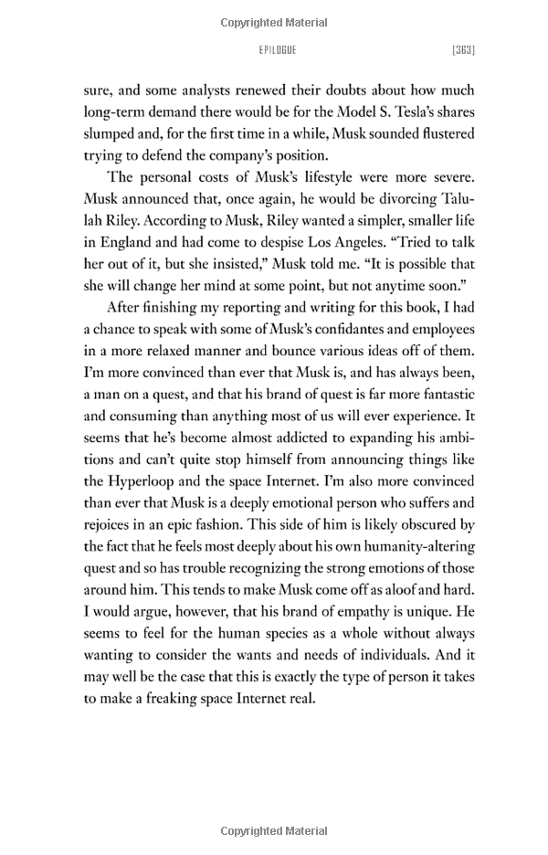 Vance uses Musk's story to explore one of the pressing questions of our time: can the nation of inventors and creators which led the modern world for a century still compete in an age of fierce global competition? He argues that Musk--one of the most unusual and striking figures in American business history--is a contemporary amalgam of legendary inventors and industrialists like Thomas Edison, Henry Ford, Howard Hughes, and Steve Jobs. More than any other entrepreneur today, Musk has dedicated his energies and his own vast fortune to inventing a future that is as rich and far-reaching as the visionaries of the golden age of science-fiction fantasy.