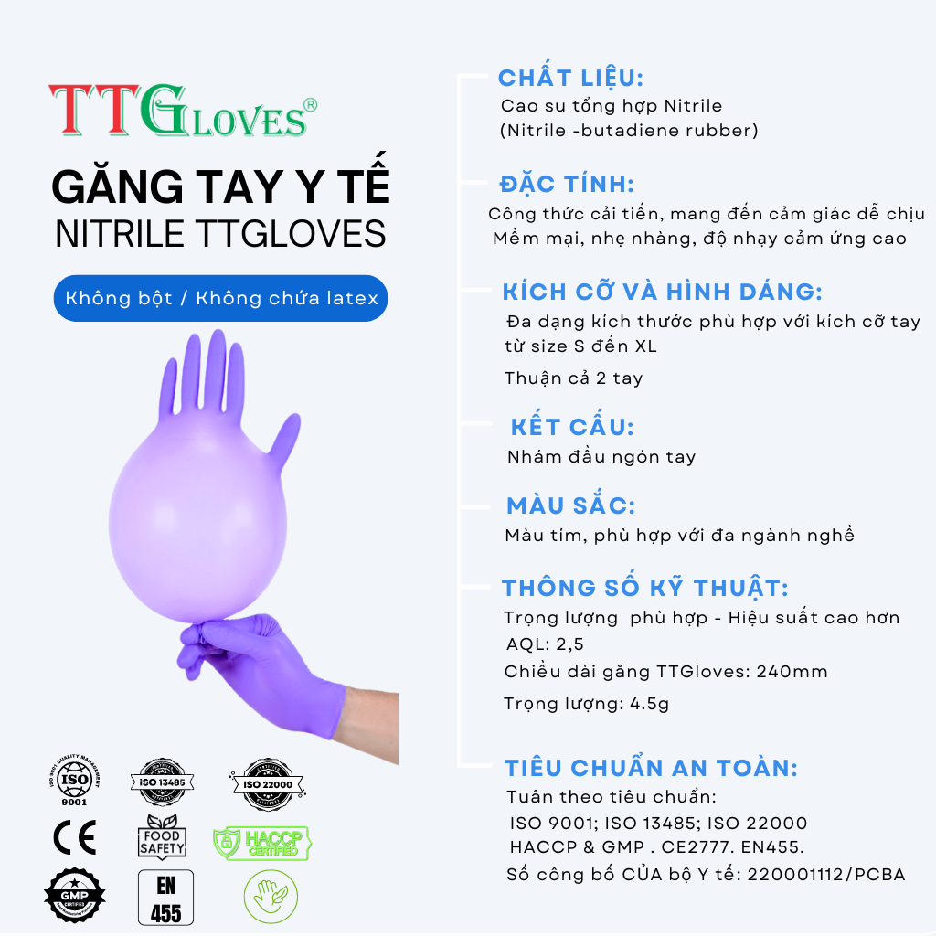 Găng Tay Cao Su Y Tế Size L Không Bột Nitrile TTGLOVES Màu Tím (100 Chiếc) TTGLoves là thương hiệu găng tay của công ty TNHH Sản Xuất & Thương Mại Toàn Tâm Gloves.