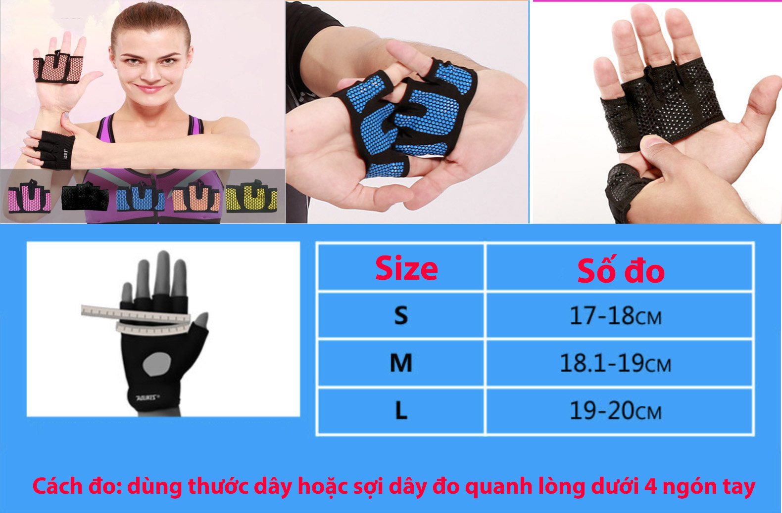 - Phần Lớp đệm với các hạt tăng độ bám dính khi cầm nắm. Các đặc tính của Găng Tay Tập GYM 4 Ngón Nửa Bàn Aolikes: • Là sản phẩm cao cấp, đạt tiêu chuẩn hàng chất lượng cao • Chất liệu: Microfiber + Vải + Lycra + Silicone • Sản phẩm được làm từ chất liệu cao cấp, có độ cao giãn giúp bạn thoải mái hơn, độ bền cực cao, độ bám dính chặt vào bề mặt nhờ lớp nhựa được tráng chất polys đặc biệt tăng bám dính. • Bảo vệ tốt nhất cho đôi bàn tay tránh khỏi tổn thương trong quá trình tập luyện • Màu sắc: Hồng | Xanh | Đen Cách chọn size Găng Tay Tập GYM 4 Ngón Nửa Bàn Aolikes