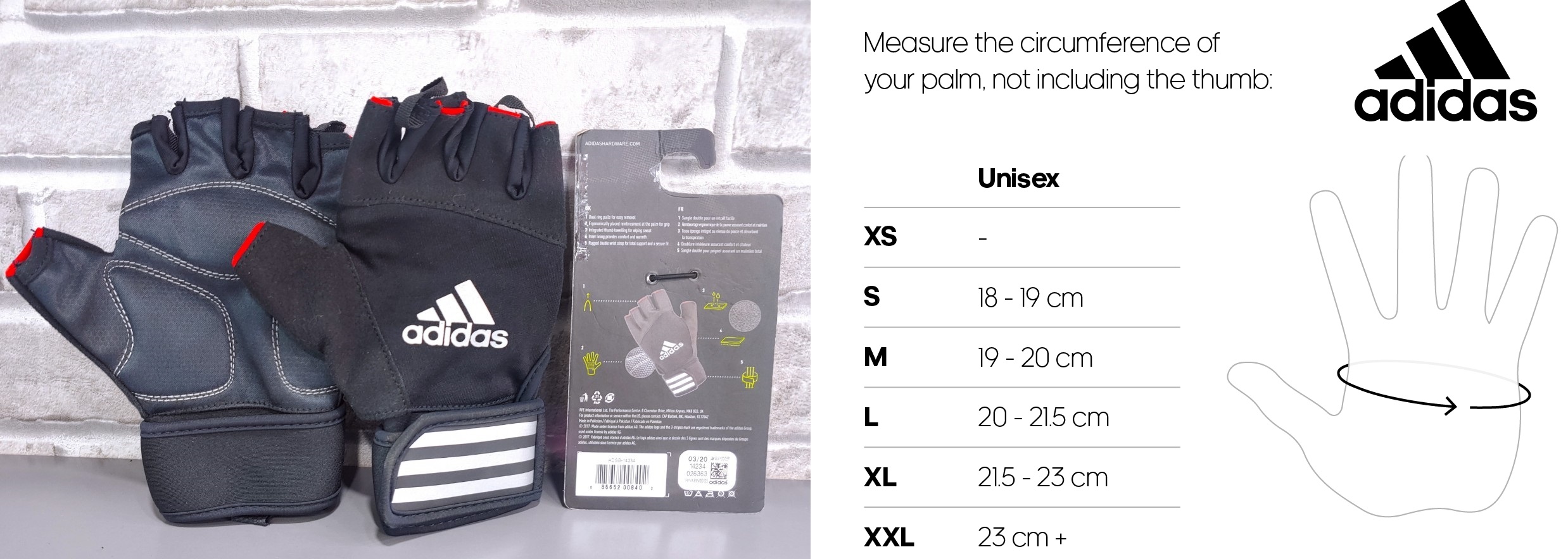 GĂNG TAY THỂ THAO ADIDAS ADGB-1422 THÔNG TIN SẢN PHẨM: - Thương hiệu: ADIDAS. - Chất liệu: Polyester (50%), Polyamide (33%), PU (17%). - Xuất xứ: Pakistan. - Trọng lượng sản phẩm: 79g. - Kích thước: 17.5 x 13.4 x