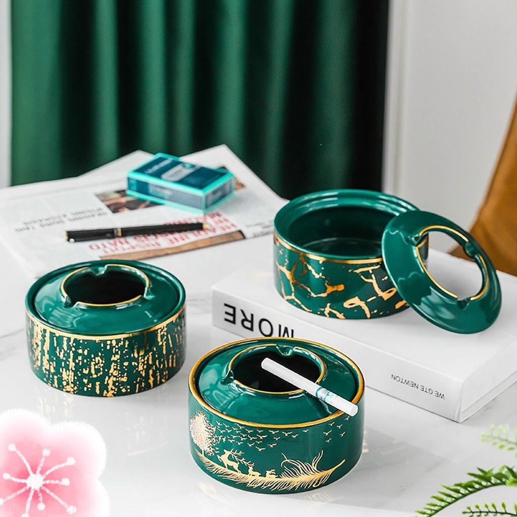 ✨GẠT TÀN BẰNG SỨ TRÒN NẮP GÁC RỜI MÀU XANH CỔ VỊT RẠN VÀNG