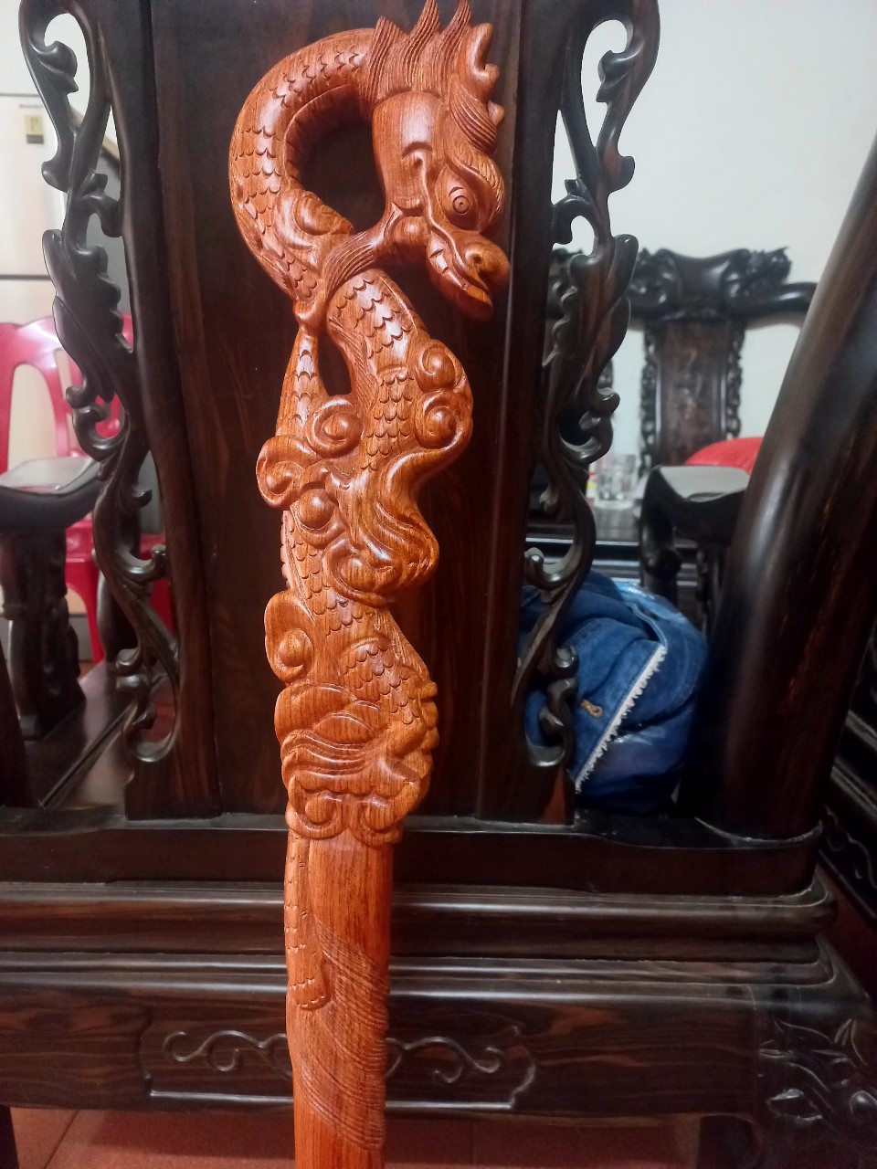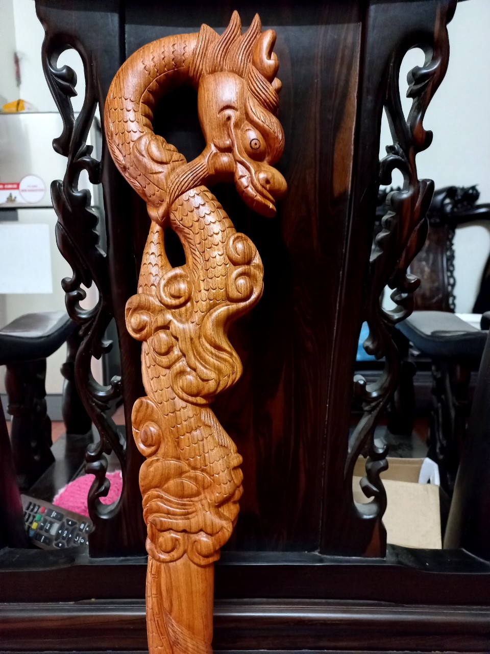 Đặc điểm nổi bật Gậy được khắc rồng cuốn từ đầu xuống chân tỉ mỉ ,tinh xảo kỳ công .Đi hầu hết tất cả mọi chi tiết góc ngách nội dung hoa văn của gậy