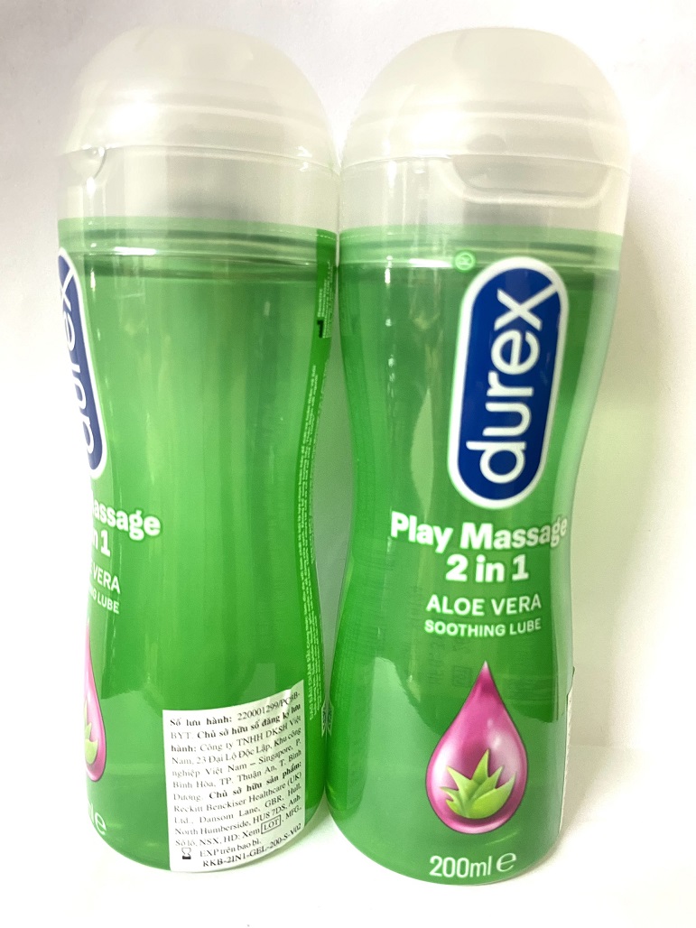 Gel bôi trơn Durex Play Massage 2in1 (200ml) Thành phần: Aqua, Propylene Glycol, Hydroxyethyl Cellulose, Benzoic Acid, Aloe Barbadensis Leaf Juice, Sodium Saccharin, Sodium Hydroxide. Công dụng: Bôi trơn và làm tăng độ ẩm tự nhiên