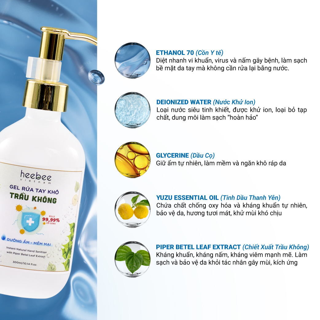 Mua tại TiktokGEL RỬA TAY KHÔ TRẦU KHÔNG HEEBEE DƯỠNG ẨM, KHÔNG KHÔ DA , DIỆT SẠCH KHUẨN ĐẾN 99.9% HAND SANITIZER GEL 65ML - 300ML ĐIỂM NỔI BẬT ‣ Đôi tay luôn là nơi chạm vào mọi điều – từ vòng tay ôm bé nhỏ, những bữa cơm gia đình, đến vô số khoảnh khắc đời thường. Vì vậy, việc giữ đôi tay sạch và an toàn không chỉ là thói quen, mà là cách ta âm thầm bảo vệ sức khỏe cho cả nhà. ‣ Gel Rửa Tay Khô Trầu Không Heebee's chắt lọc sự tinh khiết từ thiên nhiên: Lá Trầu Không kháng khuẩn lành tính, tinh dầu Yuzu thanh mát cùng dưỡng chất giữ ẩm từ Glycerine (Dầu Cọ). Công thức thuần chay, 99.4% thiên nhiên, không hóa chất gây hại – nhẹ dịu an toàn để cả mẹ bầu và em bé cũng yên tâm sử dụng hằng ngày. ‣ Giải pháp hữu cơ làm sạch và khử mùi tự nhiên, cho đôi tay luôn sạch khuẩn, mềm mịn và an toàn. Hơn cả việc vệ sinh tay, Gel Rửa Tay Khô Trầu Không Heebee's còn dịu nhẹ xoa dịu vết côn trùng cắn, mang lại sự an tâm trong từng khoảnh khắc. THÀNH PHẦN ĐIỀU GÌ KHIẾN GEL RỬA TAY KHÔ TRẦU KHÔNG HEEBEE'S KHÁC BIỆT? ‣ Sản phẩm thiết yếu cho cả gia đình: an toàn cho mẹ bầu, em bé, và mọi thành viên. ‣ Thuần chay – 99.4% thiên nhiên: không hóa chất, không lo kích ứng. ‣ Bảo vệ gấp đôi: vừa diệt khuẩn nhanh – vừa nuôi dưỡng làn da mềm mại. ‣ Liệu pháp hương xanh: Hương thơm từ Yuzu tươi mát, mang lại cảm giác dễ chịu, tinh khiết. ‣ Giải pháp toàn diện: không chỉ rửa tay, mà còn sát trùng, làm dịu da, bảo vệ mọi lúc mọi nơi. CÔNG DỤNG ‣ Làm sạch da tay và tiêu diệt tới 99,99% vi khuẩn và nấm trên da ‣ Khử mùi khó chịu, đồng thời nuôi dưỡng đôi tay mềm mại nhờ chiết xuất tự nhiên ‣ Giảm sưng đỏ, ngứa rát do côn trùng hay viêm da tiếp xúc, mang lại cảm giác dễ chịu tức thì ĐỐI TƯỢNG SỬ DỤNG Phù hợp với mọi loại da, kể cả da nhạy cảm. An toàn với thai phụ và trẻ nhỏ. CÁCH SỬ DỤNG ‣ Lấy một lượng nhỏ ra tay; xoa đều cả hai bàn tay, các kẽ tay, lòng bàn tay và các ngón tay trong vòng 30 giây. Không cần rửa lại với xà phòng và nước. ‣ Sử dụng trước và sau khi ăn, sau hoạt động nơi công cộng, sau khi cầm tiền, khi bị côn trùng cắn hoặc bất cứ khi nào cần vệ sinh và diệt khuẩn trong ngày. BẢO QUẢN Bảo quản nơi thoáng mát, tránh nơi có nhiệt độ quá cao hoặc quá thấp, nơi có ánh sáng trực tiếp. CHÚ Ý Gel Rửa Tay Khô Trầu Không Heebee's có thành phần thiên nhiên nên rất an toàn cho sức khỏe người tiêu dùng, tuy nhiên vẫn cần lưu ý: ‣ Chống chỉ định đối với trường hợp người có sự mẫn cảm bẩm sinh với 1 vài loại thành phần thiên nhiên có chứa trong sản phẩm. ‣ Không nên sử dụng trên vết thương hở, trầy xước. ‣ Chỉ sử dụng ngoài da. Đối với trẻ em khi sử dụng phải có sự giám sát của người lớn. THÀNH PHẦN CHI TIẾT Ethanol 70; Deionized water (Nước Cất); Glycerine (Dầu Cọ); Yuzu essential oil (Tinh Dầu Thanh Yên); Piper betel leaf extract (Chiết Xuất Trầu Không).