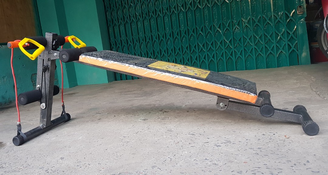 HƯỚNG DẪN SỬ DỤNG 1/ Tập bụng trên: Ngồi vào ghế như hình móc 2 chân vào đệm cao su, nằm thẳng người xuống, hít hơi vào dùng sức nâng người lên lúc này thở ra. Ngồi như tư thế trên, khi xuống kết hợp vặn người sang trái (hoặc phải) để tập eo. 2/ Tập bụng dươi: Nằm ngửa, 2 tay bám vào đệm cao su, 2 chân duỗi thẳng nâng lên cao, thóp bụng, hít hơi vào lại rồi hạ xuống từ từ không chạm đất, lúc này thở ra . Rồi lập lại như trên nhiều lần. 3/ Tập vai tay trước: Ngồi móc chân vào đệm cao su, hai tay nắm đầu dây, kéo căng lực dây ra 2 bên, lập đi lập lại nhiều lần. 4/ Tập hít đât: Hai tay nắm vào đầu mút. Người ngã về hướng ghê, hai khuỷu tay gấp lại đồng thời hít vào. Dùng lực cổ tay, cánh tay, đẩy thân người nhô lên, thở ra. Lập lại nhiều lần. 5/ Tập ngực trên Ghế với tạ: Nằm ngữa trên ghế: 2 chân móc vào cao su, 2 tay nâng tạ lên cao, tập ngực và tay sau. 6/ Tập cơ lưng tư thế nằm sấp: Nằm sấp 2 chân cài vào đệm cao su, 2 tay đặt sau gáy, nâng người lên. Tập cơ lưng khòe dẻo dai.