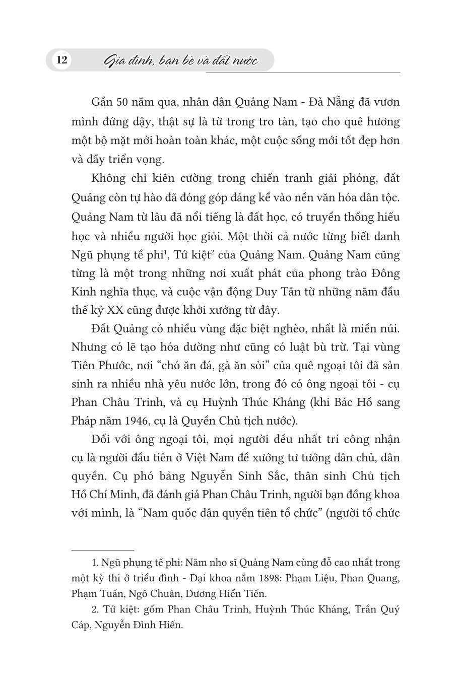 Bằng ngôn từ giản dị, gần gũi, sâu lắng mà toát lên được tinh thần yêu nước và ý thức trách nhiệm, tấm lòng vì nước vì dân trong từng câu chữ, qua những trang sách Gia đình, bạn bè và đất nước, bà Nguyễn Thị Bình - nhân chứng đã tham gia, chứng kiến những biến chuyển thăng trầm của lịch sử dân tộc trong thế kỷ 20 - nhìn lại cuộc đời gắn liền với vận mệnh đất nước của mình.