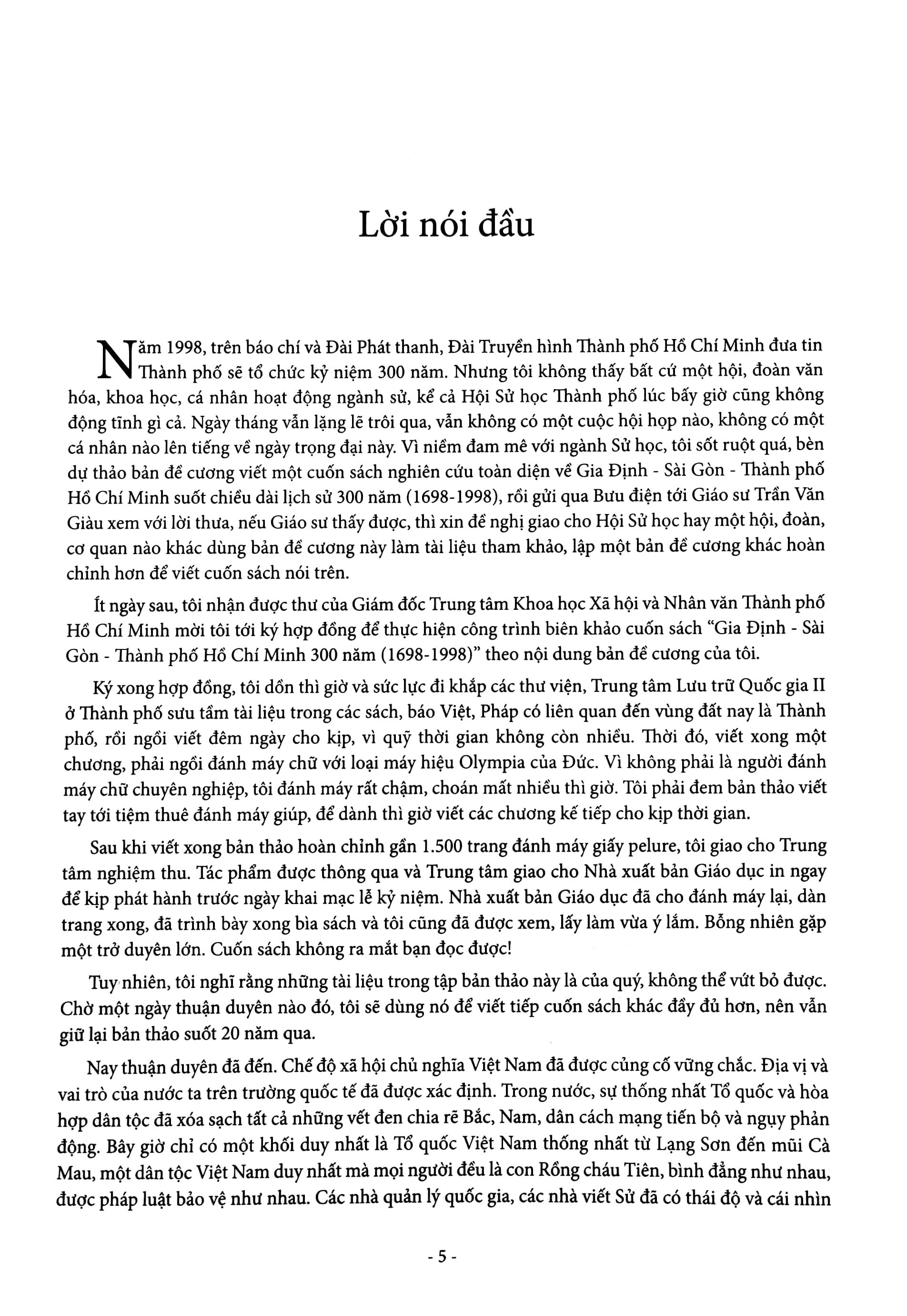 "Lâu nay đã có nhiều người viết về thành phố Sài Gòn - Chợ Lớn, Thành phố Hồ Chí Minh. Nhưng mỗi người chỉ viết về một vấn đề, một mảng của Thành phố, chưa có tác phẩm nào viết bao quát toàn diện các khía cạnh, các lĩnh vực hoạt động của Thành phố. Ngay như bộ sách Địa chỉ văn hóa Thành phố Hồ Chí Minh cũng chỉ nói một cách đại cương về lĩnh vực lịch sử, văn hóa, nghệ thuật, tư tưởng, tôn giáo, mà không nói đến các lĩnh vực khác. Nay với tác phẩm này, tôi muốn cung cấp cho độc giả một cái nhìn bao quát, toàn diện, cụ thể các giai đoạn lịch sử, từ năm 1698 đến năm 2020, các chế độ chính trị, các lĩnh vực hoạt động về hành chính, kinh tế, xã hội, văn hóa, giáo dục, y tế, tôn giao fin ngưỡng, thể dục thể thao, của từng thời kỳ. Tóm lại tác phẩm này vi như một tập cẩm nang mà mọi cơ quan, can bộ, công chức, mọi gia đình trong Thành phố nên có để khi muốn fim kiếm một vấn đề gì liên quan đến Thành phố, chỉ việc mở sách ra là được thỏa mãn ngay, khỏi phải đi tìm đâu xa".