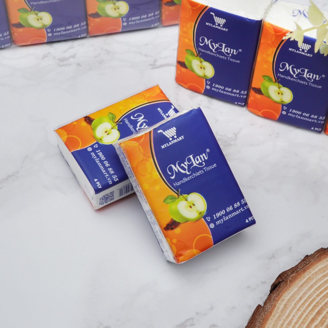 KHĂN GIẤY BỎ TÚI MYLAN TÁO là sản phẩm cao cấp của công ty giấy Mylan luôn nói không với hóa chất OBA, không tái chế, không tẩy trắng chính là chân ái, ""VẬT BẤT LY THÂN"" dành cho mọi người mỗi khi ra ngoài, giúp đánh bay mọi khó chịu khi bị dị ứng thời tiết, viêm xoang và cả những vết bụi bẩn bám trên da.