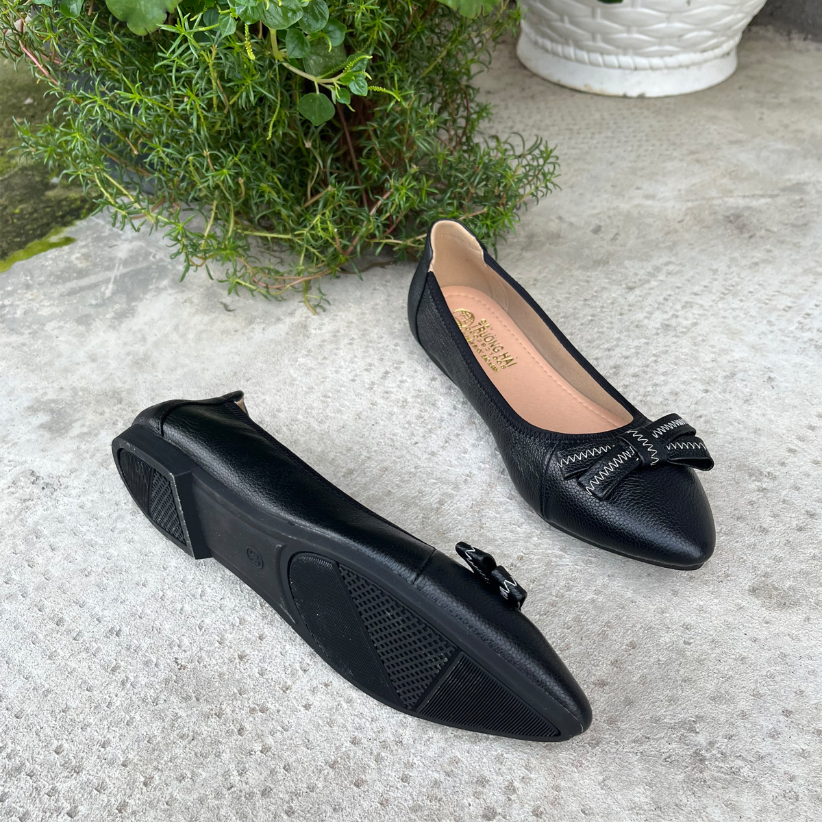 - Giày búp bê da bò mũi nhọn đế bằng Trường Hải da mềm màu đen GBB125 CÓ DÁNG FORM chuẩn ôm chân