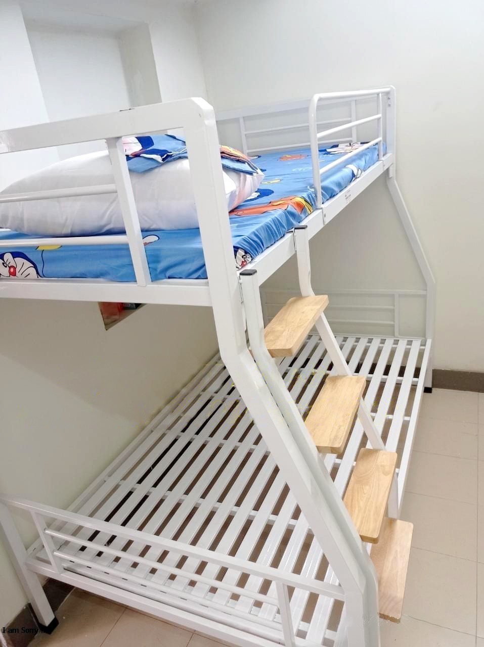 ● Chất liệu: Sắt sơn tĩnh điện không rỉ ● Kích thước :  Tầng trên rộng 1m đến 1m4  , tầng dưới rộng 1m2 đến 1m6.  Chiều dài 2m1 (cả phủ bì). ● Chiều cao tổng là 1m7. Khoảng cách giữa 2 tầng là 1m. Từ mặt đất lên mặt tầng 2 là 1m35 ● Khung chân là sắt hộp 40x40mm, dày 1.2mm. Có nắp bịt cao su dưới chân giường ● Dát giường là sắt lá tôn 5 zem ● Sơn tĩnh điện có các màu : trắng ,đen , kem, hồng. Ưu điêm, công dụng của giường tầng  ● Là giải pháp tối ưu nhất cho căn phòng chật hẹp, tăng diện tích sử dụng cho căn phòng ● Đảm bảo tối ưu nhất về bền và chắc chắn ● Giá cả rẻ hơn so với các loại giường tầng khác ● Tính thẩm mỹ cao cho căn phòng, dễ dàng vệ sinh ● Đa dạng  kích thước rộng theo kích thước đệm ● Là giường lắp ghép dễ dàng tháo lắp và vận chuyển khi cần ● Thang leo  tối ưu vô cùng dễ dàng và an toàn khi leo lên