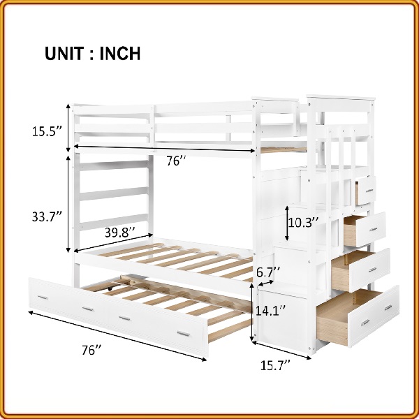 Giường tầng thấp XK Lincoln 1m2/1m2 có kích thước lọt lòng giường trên/dưới là 120x193 cm, phủ bì 208x128x90 cm, chân trụ dày 30x60 mm chịu lực tốt. Ngoài ra, giường còn tích hợp 3 ngăn kéo để đồ tiện lợi, tiết kiệm không gian. Thang giường được làm từ gỗ Plywood chắc chắn, dẻo dai với 13 thanh (cung sinh) bắt vít. Chất liệu gỗ thông xẻ sấy nhập khẩu được gia công tỉ mỉ, kết cấu chắc chắn, giúp các bé vui chơi an toàn và có những giấc ngủ ngon. Giường có 2 loại kích thước là 1m/1m và 1m2/1m2. Tùy nhu cầu, Quý khách có thể chọn loại chỉ giường để gầm thông thoáng, thêm ngăn kéo để đồ hay thêm giường kéo tăng chỗ ngủ. Kích thước DxRxC cả 2 hộc kéo là 95x11x40 cm, giường kéo là 100x185 cm. Miễn phí lắp đặt tại TP.HCM, Bình Dương, Đồng Nai.
