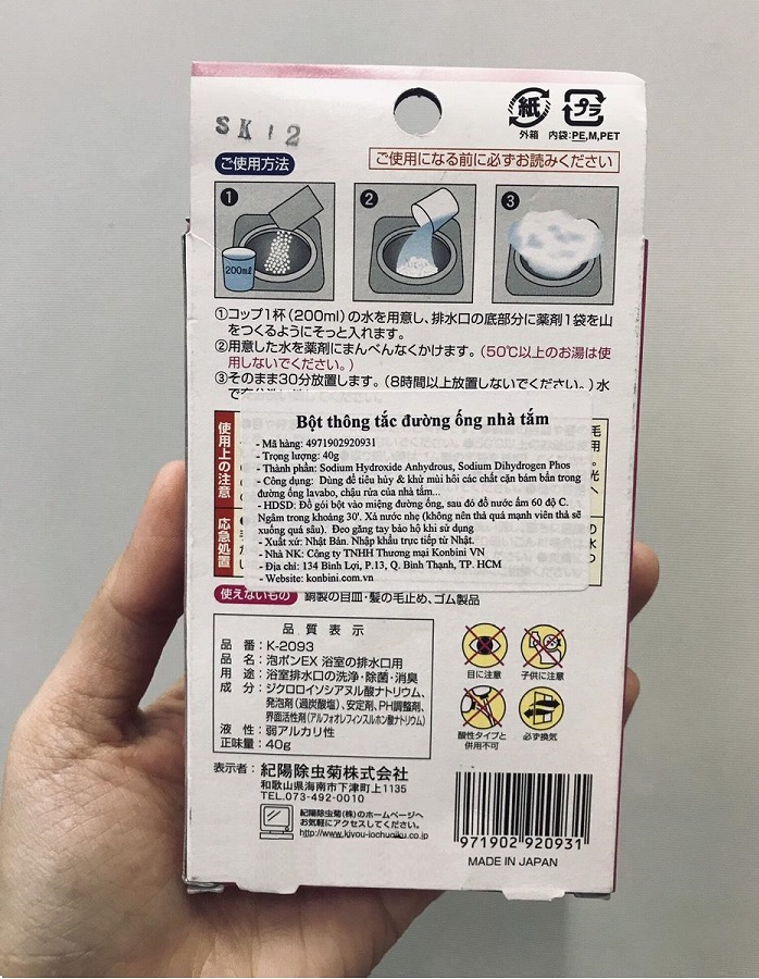 Gói bột tẩy rửa thông tắc đường ống vệ sinh đa năng - Nội địa Nhật : -Thành phần: Dichloroisocyanurate, Perborates, Natriaxit, chất hoạt động bề mặt, phụ gia... -Công dụng : -