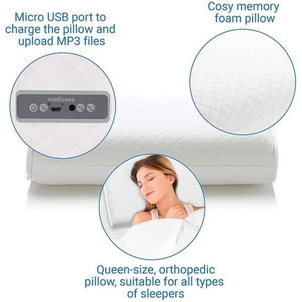 Chương trình Sleep Genius Music, giúp bạn đi vào giấc ngủ nhanh hơn cũng như ngủ sâu hơn, lâu hơn, được bao gồm trong Gối Medisana SP 100 Sleep Well Kissen. Một cổng micro USB để sạc và tải lên các tệp MP3 bổ sung cho gối cũng như tai nghe có cổng âm thanh. Pin là không cần thiết.