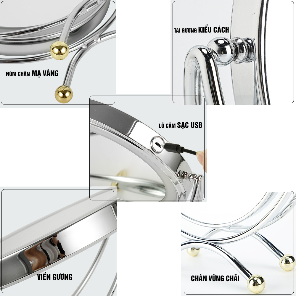 Gương trang điểm để bàn LED, Crom, phóng đại zoom x3, 2 mặt xoay siêu nét Minh House Mô tả gương trang điểm để bàn Crom phóng đại zoom x3, 2 mặt xoay siêu nét
