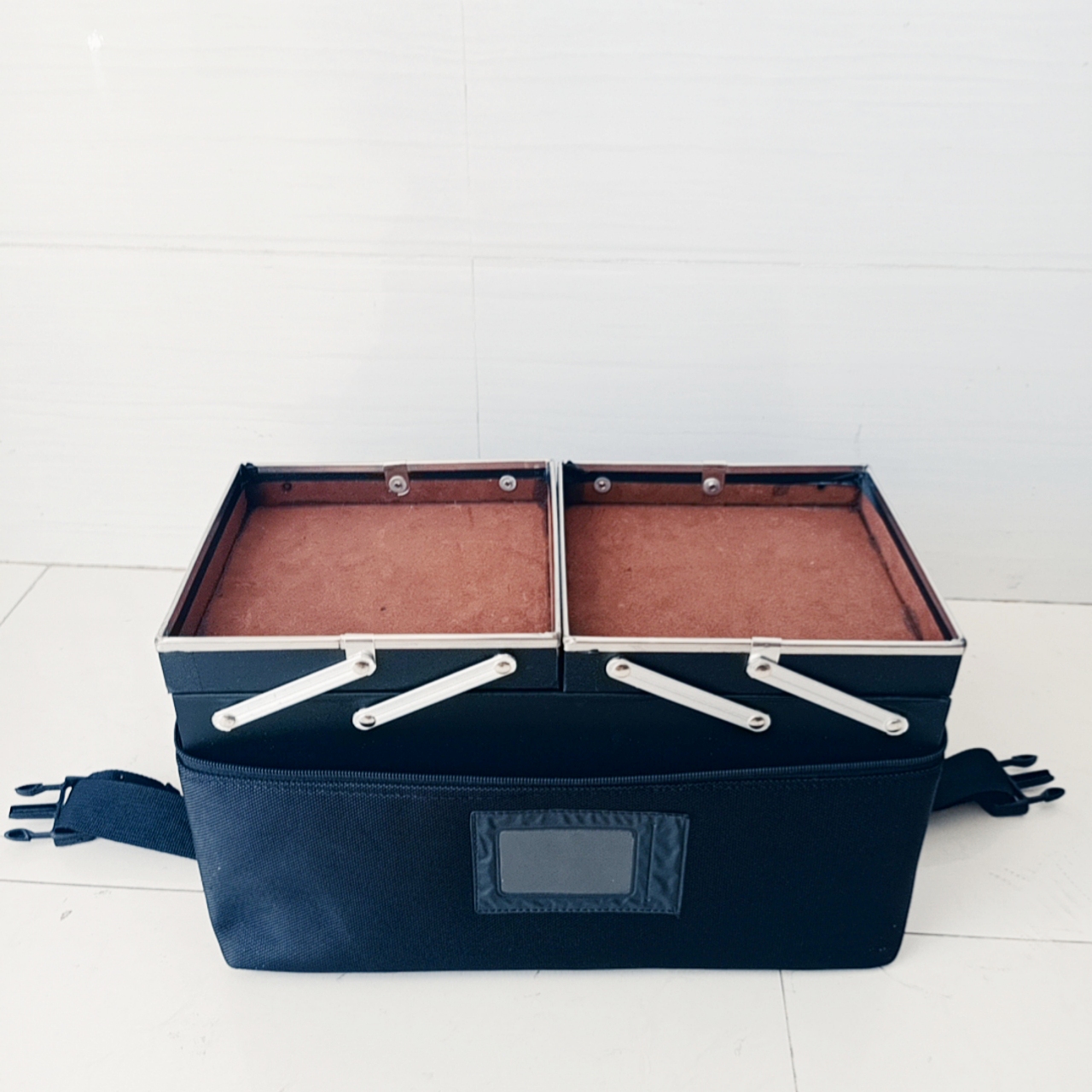 • Bao gồm 1 thùng to có 2 tầng 4 măm vuông nhỏ lót nhung, có thể tháo rời khỏi túi