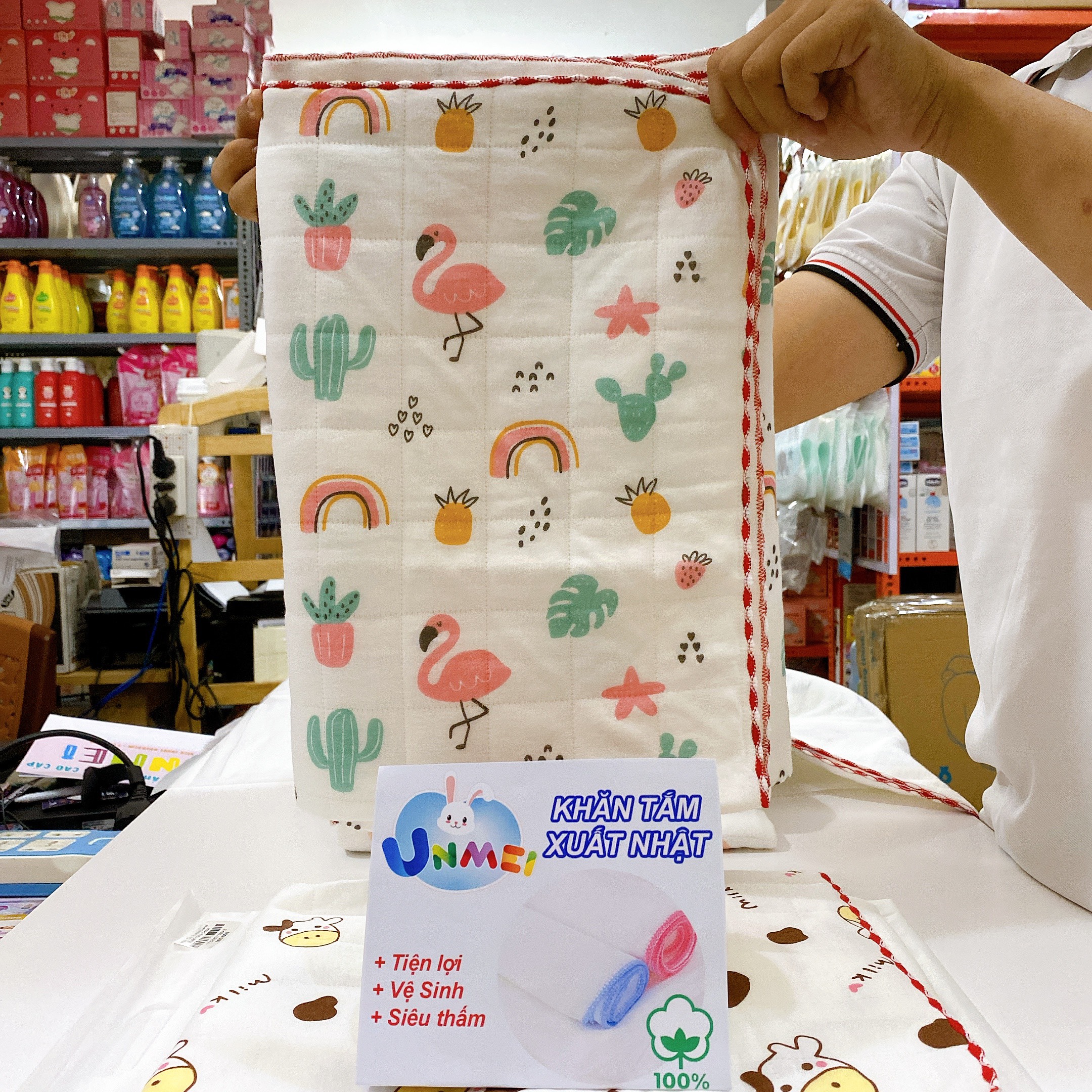 - Khăn có chất lượng tốt là khăn khi sờ bằng tay. Cảm nhận được bề mặt mịn màng, mềm mại. Sau khi sử dụng không bị khô cứng, thô ráp, không gây trầy xước và tổn hại đến làn da của bé Unmei Trading cam kết: