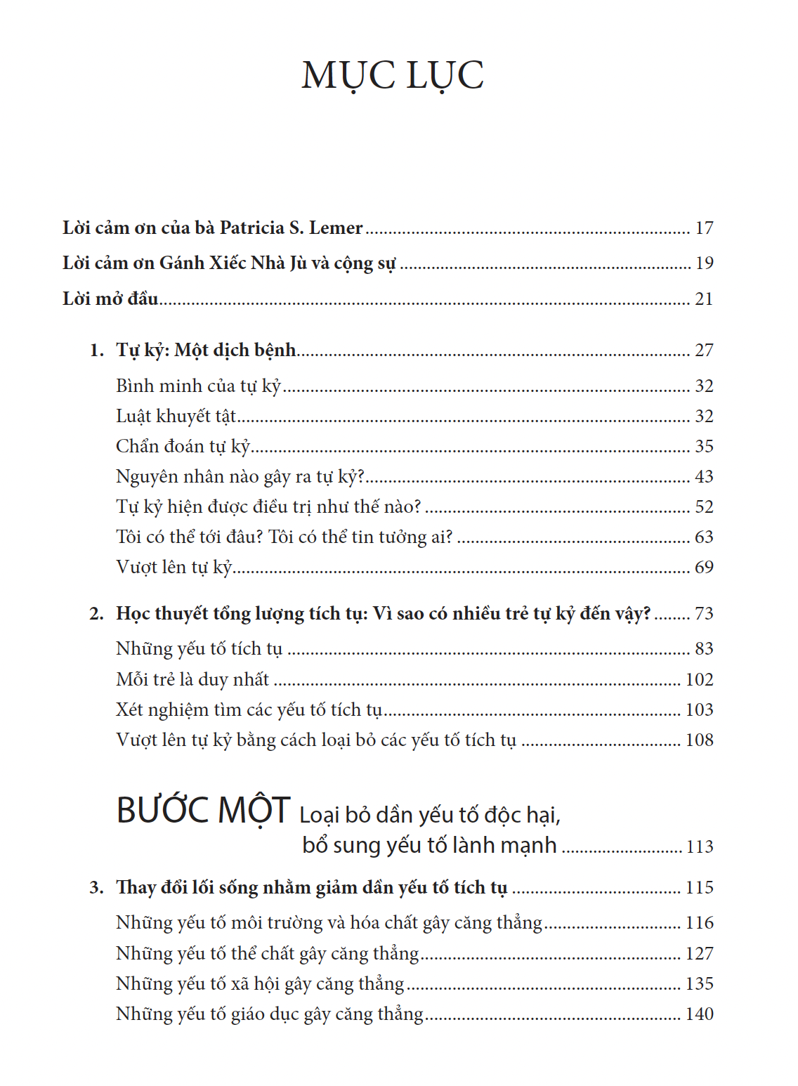 Hành trình vượt lên tự kỷ của tác giả Patricia S. Lemer là một bộ sách toàn diện nhất về tự kỷ hiện nay. Những nội dung trong bộ sách là kiến thức, kinh nghiệm mà tác giả đã đúc rút trong suốt 45 năm làm việc về tự kỷ. Theo bà, tự kỷ không phải tự nhiên xuất hiện vào một thời điểm nào đó trong cuộc đời đứa trẻ, mà nó chính là sự sụp đổ của toàn bộ cơ thể và não bộ khi đứa trẻ bị tác động đồng thời bởi nhiều yếu tố căng thẳng: sinh học, môi trường, miễn dịch, thần kinh, tâm lý và độc tố. Các tác động tiêu cực trên đè nặng lên cơ thể bé nhỏ của đứa trẻ gây ra sự sụp đổ của hệ giác quan, vận động, ngôn ngữ, cảm xúc – xã hội và các hệ khác. Và hiển nhiên, khi đó đứa trẻ sẽ bị chẩn đoán “tự kỷ” với hàng loạt các triệu chứng chung. Với cách tiệp cận toàn diện về tự kỷ, tác giả đã đưa ra 5 Bước giúp loại bỏ dần các yếu tố gây căng thẳng cho người tự kỷ. Bước 1: Loại bỏ dần yếu tố độc hại, bổ sung yếu tố lành mạnh. Trong bước này, tác giả đề xuất những giải pháp vô cùng thiết thực và khả thi, bao gồm: chuyển đổi lối sống, tập trung nâng cao sức khỏe đường ruột, áp dụng chế độ ăn phù hợp, tăng cường hệ miễn dịch & hệ nội tiết,  và thải độc nhằm phục hồi thể chất cho người tự kỷ. Bước 2: Sửa chữa những vấn đề nền tảng của cơ thể, bao gồm các trị liệu điều chỉnh  cấu trúc cơ thể (nắn chỉnh cơ thể) và tích hợp phản xạ thần kinh vận động cảm giác (MNRI). Trong bước này, tác giả cũng dành hẳn một chương đề cập đến vấn đề chăm sóc răng miệng của người tự kỷ. Bước 3: Tập trung giải quyết những vấn đề giác quan, đặc biệt vấn đề thị giác – giác quan chủ đạo của người tự kỷ. Bước 4: Giao tiếp, tương tác và học tập. Khi thể chất người tự kỷ được phục hồi, các vấn đề giác quan được giải quyết thì lúc đó, người tự kỷ mới có năng lượng dành cho giao tiếp, tương tác và học tập. Nên việc cố gắng dành nhiều thời gian để dạy trẻ giao tiếp, tương tác và học tập khi chưa thực hiện các bước 1, 2 và 3 thì chỉ làm tiêu tốn nguồn lực của các gia đình, mà không thể giải quyết vấn đề gốc rễ của tự kỷ. Bước 5: Kế hoạch cho tương lai, tác giả đề cập nhiều mô hình chuyển tiếp cho người tự kỷ trưởng thành sau khi rời trường học. Đây có thể coi là một bộ bách khoa toàn thư về tự kỷ. Các liệu pháp cho tự kỷ được bà khuyến nghị theo một trình tự phù hợp, nhằm giúp các gia đình tối ưu nguồn lực nhưng vẫn đạt được hiệu quả tối đa trong hành trình đẩy lui tự kỷ. Thật biết ơn tác giả về những kiến thức vô giá trong tác phẩm của bà.  Hãy mở rộng tâm trí của bạn khi đón đọc tác phẩm Hành trình vượt lên tự kỷ. Tự kỷ có thể đánh bại? Tất nhiên, hoàn toàn có thể!     Bộ sách gồm 2 tập, chia làm 21 chương, dày 820 trang và được bán theo bộ. Giá trọn bộ: 400k/bộ.