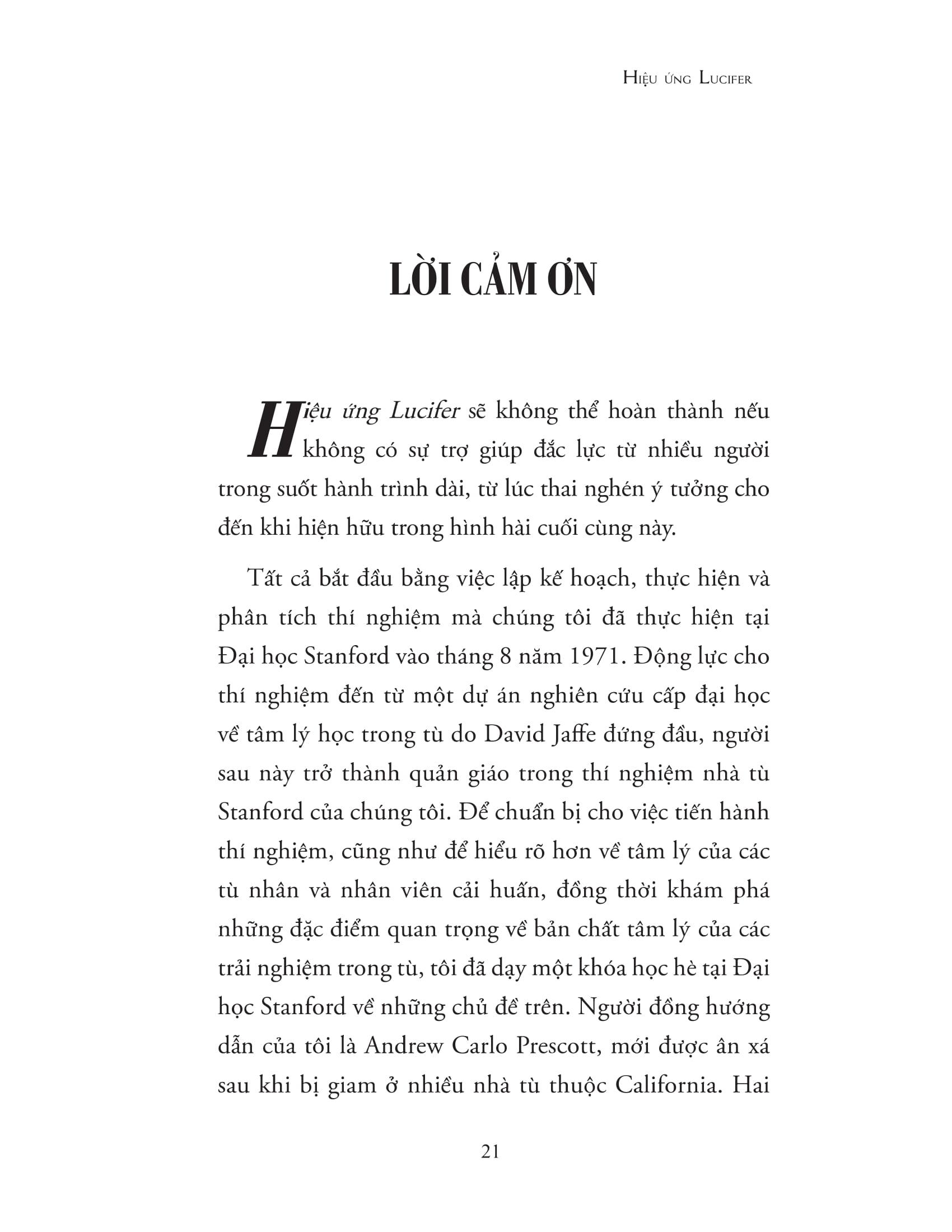Ngay cả những người bình thường nhất và tử tế nhất cũng có thể trở thành những kẻ thủ ác gây nên những hành vi tàn bạo vượt ngoài luân lý thông thường. Hiệu ứng Lucifer - được đặt tên theo Đại Thiên thần được Chúa yêu quý nhưng đã trở nên sa ngã, bị giáng xuống Địa ngục và trở thành Quỷ Satan - giải thích về lý do và cách thức mà mỗi chúng ta đều có thể trở thành những tội phạm tàn nhẫn. Cuốn sách là bản tường thuật chân thực và chi tiết nhất về thí nghiệm nhà tù Stanford kinh điển do Philip Zimbardo chủ trì thực hiện, bên cạnh việc phân tích nhiều nghiên cứu tâm lý xã hội gây sốc khác và nhìn lại những câu chuyện thực tế kinh hoàng mãi mãi in dấu trong lịch sử. Cuốn sách khiến chúng ta phải có cái nhìn khác về bản chất của con người, rằng ranh giới thiện - ác không hề bất khả x.âm phạm và mỗi cá nhân đều có thể dễ dàng sa ngã và bị cuốn theo sự tàn độc. Nhưng bằng cách hiểu được những yếu tố tâm lý chi phối tâm trí và hành vi trong những bối cảnh cụ thể, con người hoàn toàn có khả năng rèn luyện để giữ m.ình trước những cám dỗ của cái ác và sự phi nghĩa, thậm chí có thể dũng cảm đứng lên đấu tranh, thực hiện những hành động anh hùng vì những giá trị nhân đạo vĩnh cửu. Hiệu ứng Lucifer mở đầu bằng một chương phác thảo sự biến đổi của tính cách con người, về những người tốt và lương thiện bỗng quay sang thực hiện những hành vi xấu xa, thậm chí là những điều độc ác và khủng khiếp. Chương sách đặt ra câu hỏi cơ bản: Chúng ta thực sự hiểu rõ m.ình đến mức nào? Chúng ta có thể tự tin đến đâu khi dự đoán những gì m.ình sẽ làm hoặc không làm trong những tình huống mà bản thân chưa từng gặp phải? Liệu chúng ta có giống như thiên thần mà Chúa yêu mến - Lucifer, bị cám dỗ và làm những điều không tưởng với người khác hay không? Về tác giả Philip Zimbardo được quốc tế công nhận là “gương mặt đại diện cho tâm lý học đương đại”. Nghiên cứu kinh điển của ông - thí nghiệm nhà tù Stanford - vẫn còn nguyên giá trị tham khảo sau hàng thập kỷ, không ngừng khiến công chúng ngỡ ngàng về sự biến đổi tính cách của con người dưới sự tác động của những yếu tố hoàn cảnh và hệ thống đầy uy lực. Zimbardo là giáo sư của Đại học Stanford từ năm 1968, trước đó từng giảng dạy tại các trường Yale, New York và Columbia. Ông được trao nhiều giải thưởng và danh hiệu vì những cống hiến cho ngành tâm lý học. Những đề tài nghiên cứu ông đặc biệt quan tâm là ý thức về thời gian, sự thuyết phục, sự điên rồ, sự bạo lực, tâm lý chính trị, chủ nghĩa khủng bố và chủ nghĩa anh hùng. Một số lời khen “Hiệu ứng Lucifer sẽ vĩnh viễn thay đổi cách bạn suy nghĩ về lý do khiến chúng ta hành xử theo những cách nhất định, và đặc biệt thay đổi cách bạn suy nghĩ về khả năng gây tội ác của một con người. Đây là một cuốn sách làm ta khó chịu, nhưng cực kỳ cần thiết.” - Malcolm Gladwell “Một cuốn sách quan trọ Tất cả các chính trị gia và nhà bình luận xã hộ đều nên đọc tác phẩm này.” - The Times (London) “Rất chuyên sâ Zimbardo kết hợp một nghiên cứu tâm lý xã hội dày đặc thông tin, đầy thu hút với tinh thần đạo đức chính trực, qua đó thách thức độc giả nhìn xa hơn những lời lên án hời hợt để suy ngẫm về trách nhiệm tập thể của chúng ta đối với những tệ nạn trên thế giới này.” - Publishers Weekl