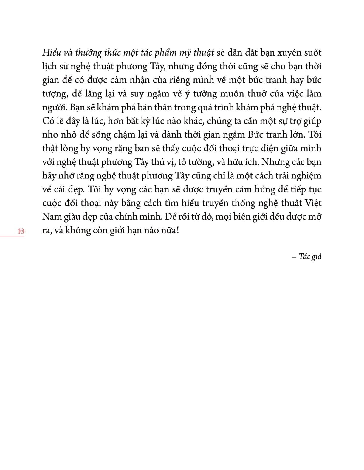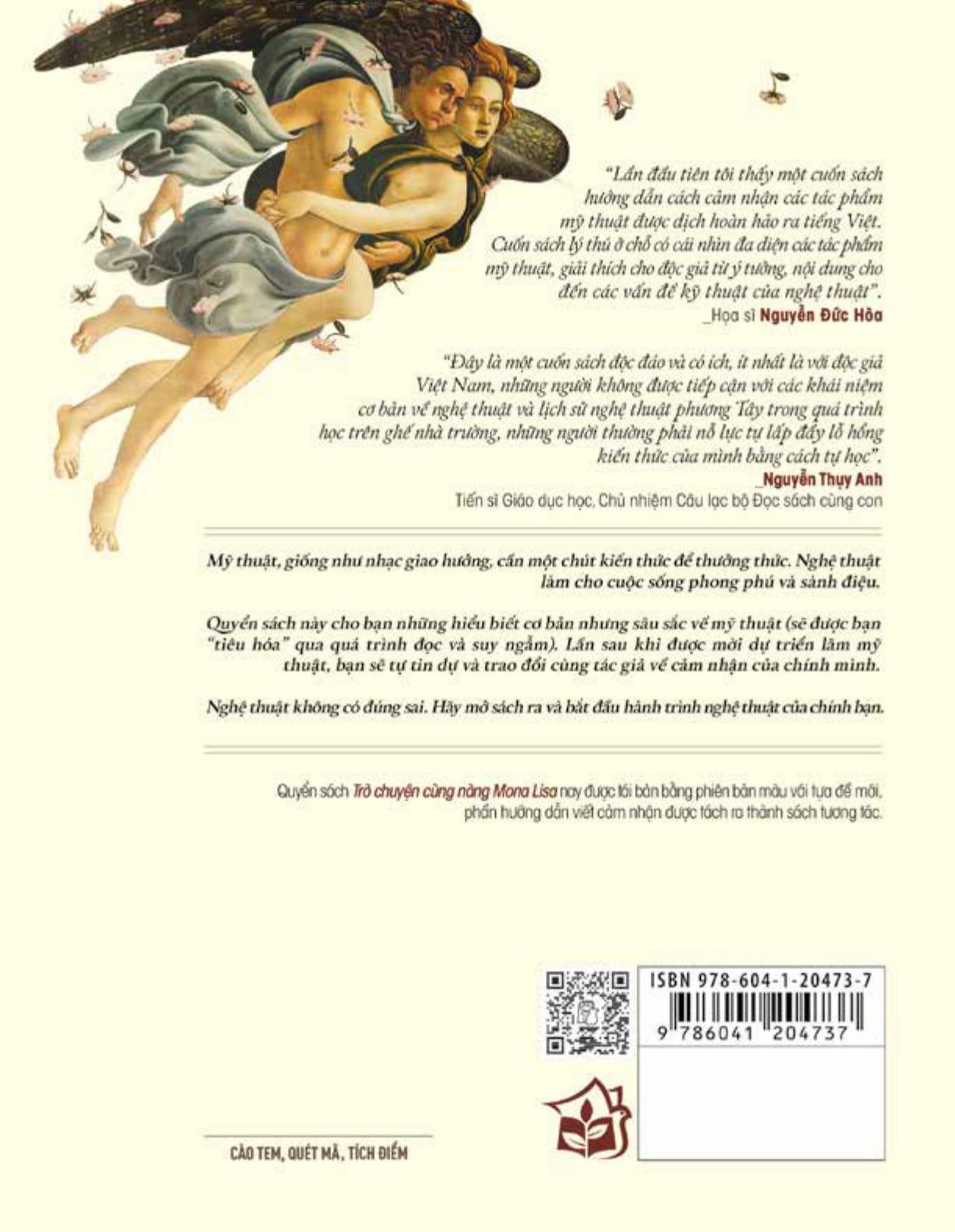 Quyển sách này cho bạn những hiểu biết cơ bản nhưng sâu sắc về mỹ thuật (đã được bạn "tiêu hóa" qua quá trình đọc và suy ngẫm). Để lần sau khi được mời dự triển lãm mỹ thuật, bạn sẽ tự tin dự và trao đổi cùng tác giả về cảm nhận của chính mình.