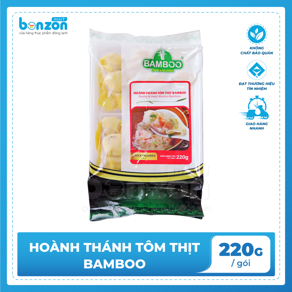Mua tại TiktokVới sản phẩm tươi sống, trọng lượng thực tế có thể chênh lệch khoảng 10%. ĐỊNH LƯỢNG: 220/gói THÀNH PHẦN: - Hoành thánh: Thịt heo (1948 %), tôm (16.52%), cá, bột mì, nấm đông cô, trứng, tinh bột khoai tây, nước tương, mè trắng, bột năng, muối, tiêu, đường - Nước súp: Nước hầm xương gà, củ cải muối, củ cải trắng, gừng, hành tím, dầu hào, đường, muối, bột ngọt (E621) CÁCH CHẾ BIẾN: Không rã đông. Thêm 150 ml nước + 1 gói soup, nấu sôi. Cho 5 pcs hoành thánh vào nấu sôi vừa trong 3.5-4.5 phút BẢO QUẢN: Ở nhiệt độ -18°C hoặc trong ngăn đá tủ lạnh. Không đông lại sau khi đã rã đông HSD: 12 tháng