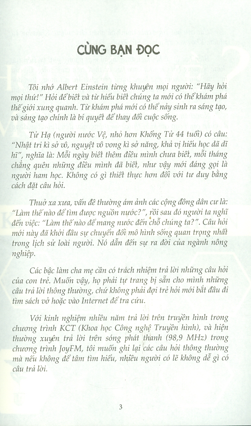 Với kinh nghiệm nhiều năm trả lời trên kênh truyền hình trong chương trình KCT(Khoa học Công nghệ Truyền hình), và hiện thường xuyên trả lời trên sóng phát thanh(98.9MHz) trong chương trình JoyFM, tôi ghi lại các câu hỏi thông thường mà nếu không để tâm tìm hiểu, nhiều người có lẽ không dễ gì có câu trả lời.