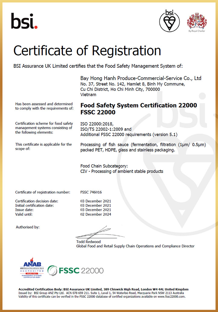 Nước Mắm Cá Đen Phan Thiết đạt chứng nhận tiêu chuẩn HACCP ( tiêu chuẩn VSATTP Châu Âu), OCOP 4 SAO (hạng mục tỉnh Bình Thuận), có giấy phép kiểm định của viện Pasteur HCM