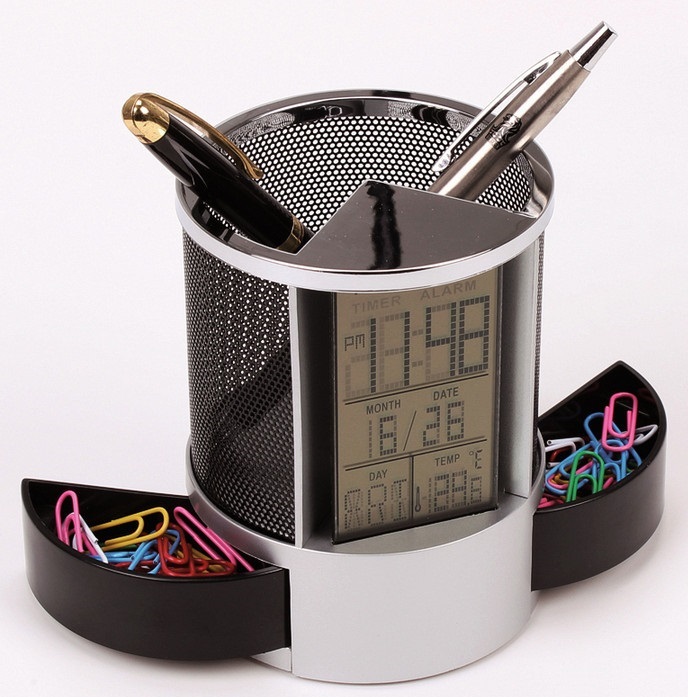 Khay đựng bút; dụng cụ văn phòng có đồng hồ