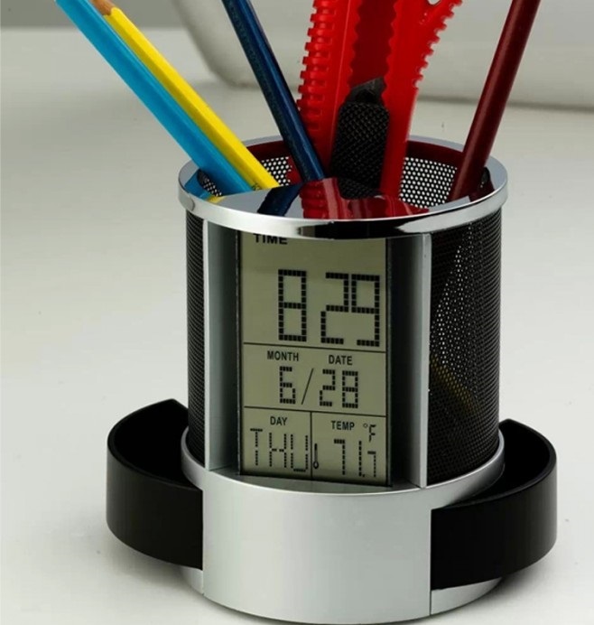 Khay đựng bút có đồng hồ lịch kỹ thuật số để bàn đa chức năng.