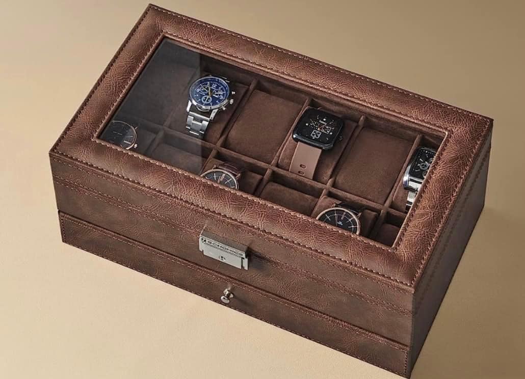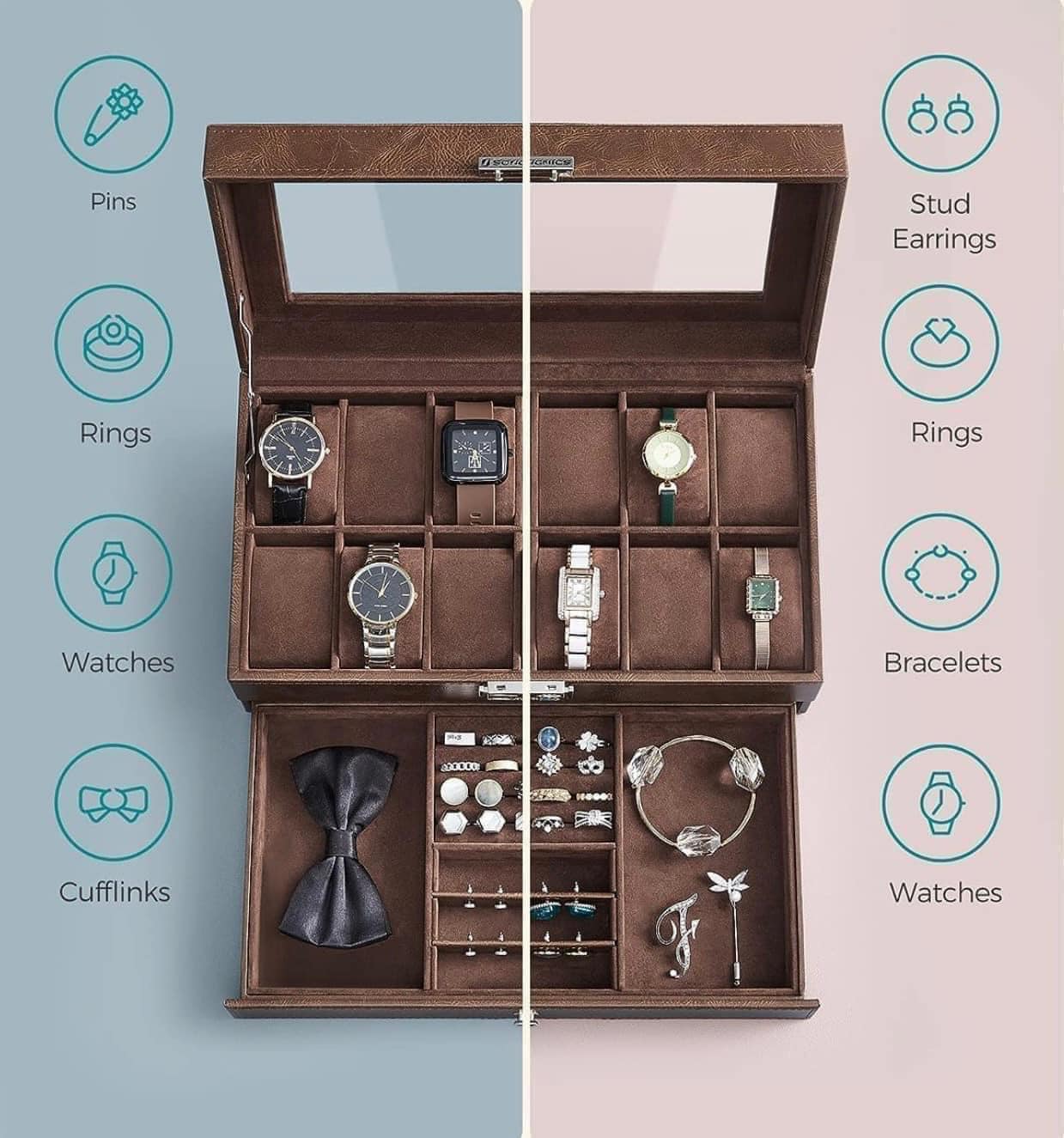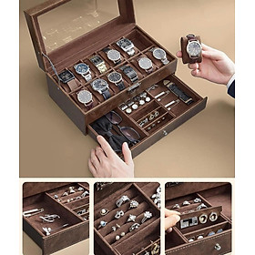 Với 12 khe cắm đồng hồ ở tầng đầu tiên và nhiều ngăn khác nhau ở ngăn kéo dưới cùng thích hợp dây đeo đồng hồ, trang sức