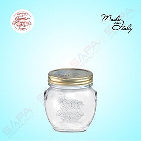Nắp đậy màu vàng đồng nổi bật có in logo thiết kế dạng xoay giúp đậy kín và cách ly thực phẩm khỏi bụi bẩn. Phần thân chai cách điệu với logo Quattro Stagioni in nổi vừa đẹp mắt vừa có công dụng chống trơn trượt và làm nổi bật sự tinh tế của chất liệu thủy tinh.