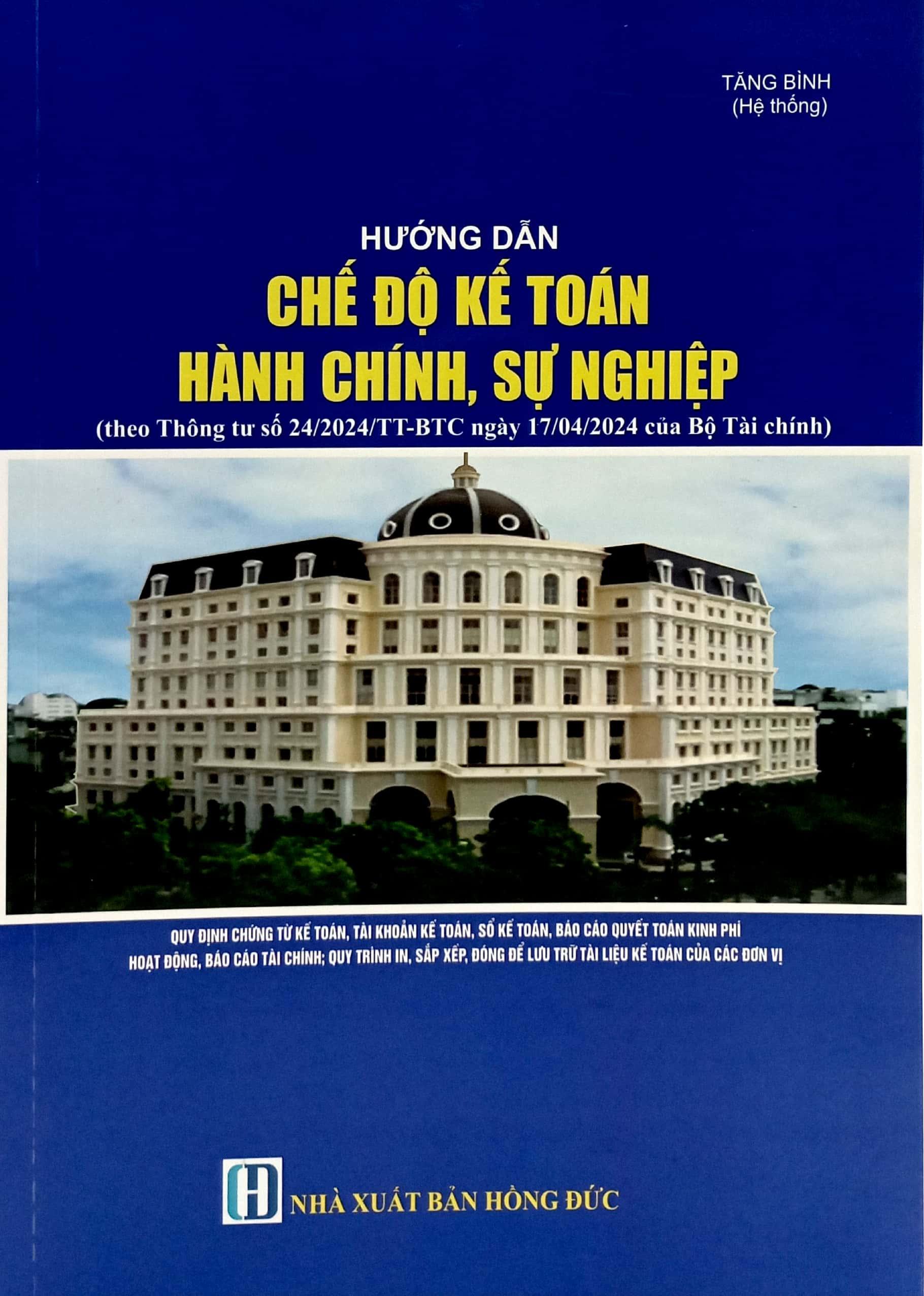 Ngày 17 tháng 4 năm 2024, Bộ Tài chính ban hành Thông tư số 24/2024/TT-BTC hướng dẫn Chế độ kế toán hành chính, sự nghiệp gồm: chứng từ kế toán, tài khoản kế toán, sổ kế toán, báo cáo quyết toán kinh phí hoạt động, báo cáo tài chính; quy trình in, sắp xếp, đóng để lưu trữ tài liệu kế toán của các đơn vị. Đối tượng được áp dụng cho các đơn vị kế toán, bao gồm: Cơ quan nhà nước (trừ Ủy ban nhân dân xã, phường, thị trấn sử dụng ngân sách cấp xã); Đơn vị sự nghiệp công lập; Tổ chức chính trị; tổ chức chính trị – xã hội; Mặt trận Tổ quốc Việt Nam và tổ chức, cơ quan, đơn vị khác là đơn vị sử dụng ngân sách nhà nước; Tổ chức, cơ quan, đơn vị thực hiện cơ chế tài chính của đơn vị sự nghiệp công lập.