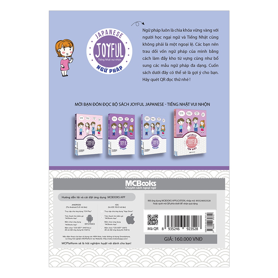 Tiếng Nhật được mệnh danh là 1 trong 4 ngôn ngữ khó học nhất trên thế giới. Nếu không có phương pháp học phù hợp, bạn sẽ rất dễ chán nản và từ bỏ. Và Joyful Japanese – Tiếng Nhật vui nhộn ngữ pháp sẽ đưa ra những phương pháp vừa học vừa chơi để bạn nhanh chóng, dễ dàng học được thật nhiều từ vựng, giao tiếp cơ bản bằng tiếng Nhật. Nếu bạn đang: Rất yêu thích và muốn tìm hiểu kỹ hơn nền văn hóa đặc sắc và thú vị của đất nước xứ xở hoa anh đào Bạn muốn giao tiếp cơ bản với những vị khách Nhật đáng mến Bạn muốn học tiếng Nhật để có cơ hội nghề nghiệp ổn định với mức thu nhập cao Dù rất thích nhưng bạn đang e dè vì nghe nói tiếng Nhật rất khó Học tiếng Nhật vui nhộn, không còn căng thẳng, nặng nề cùng Joyful Japanese Xuyên suốt cuốn sách là nhân vật tên “Lan”. Theo chân “Lan”, bạn sẽ tìm thấy những giờ học vui nhộn đầy bổ ích. Cuốn sách không chỉ giúp bạn học được thật nhiều từ mới, mẫu câu mà còn giúp bạn hiểu biết thêm về văn hóa của đất nước và con người Nhật Bản. Sách tập trung vào những kiến thức hội thoại thực tế được sử dụng trong cuộc sống và đặc biệt cung cấp rất nhiều tranh minh họa sinh động để người đọc dễ dàng nắm bắt được bối cảnh sử dụng. Cuốn sách Joyful Ngữ pháp nằm trong bộ gồm 4 cuốn: Giao tiếp, Từ vựng, Ngữ Pháp, Tập Viết. Bạn có thể tham khảo mua trọn bộ sách này để hoàn thiện các kỹ năng nghe – nói – đọc – viết tiếng Nhật. Nội dung Joyful Japanese Ngữ Pháp có gì đặc biệt? Sách gồm 18 bài học. Mỗi bài là tổng hợp những kiến thức ngữ pháp xuất hiện trong cuốn Joyful Giao tiếp. Mỗi câu trong sách đều được đưa rất nhiều ví dụ và giải thích chi tiết cách sử dụng. Cuối mỗi bài sẽ có phần bài tập giúp bạn kiểm tra cũng như hệ thống lại những kiến thức của mình.