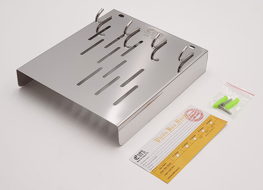 - Trọng lượng : 460 Grs * Bảo hành : 2 năm Với kệ cài dao muỗng Eurolife bạn không những tiết kiệm tối đa không gian bếp mà còn tạo ra sự gọn gàng, sang trọng bậc nhất cho không gian bếp nhà bạn. THIẾT KẾ TIỆN LỢI Ưu điểm vượt trội : Kệ cài dao- muỗng Inox Eurolife EL-K6 được làm từ Inox SUS 304 cao cấp, sáng bóng, dễ lau chùi vệ sinh. Kệ được thiết kế giá cài dao phía sau , an toàn khi sử dụng hay thao tác công việc bếp. Kệ được tích hợp bộ cài dao ngay sau sống kệ cực kỳ tiện dụng và an toàn. Ngoài ra kệ còn có thể treo vá-muỗng lớn, và phụ kiện bếp. Ngoài ra kệ còn có thể treo vá-muỗng lớn, và phụ kiện bếp với 4 móc treo phía mặt bên ngoài kệ, rất tiện dụng. Mặt kệ được thiết kế với các lỗ thoát nước, thông hơi, thoáng khí giúp vật dụng luôn khô ráo , sạch sẽ. Các móc treo bằng Inox 304 được hàn chặt chẽ, chịu lực cao, tiện dụng cho gian bếp. Kệ được làm từ Inox SUS 304 dày 1mm, sáng bóng, không han rỉ và bền bỉ với thời gian. LẮP ĐẶT ĐƠN GIẢN Kệ được lắp đặt đơn giản với 2 ốc vít phía sau lưng. Ốc vít và tackle đi kèm THÔNG SỐ KỸ THUẬT BỘ SẢN PHẨM ĐẦY ĐỦ TIỆN DỤNG CHO MỌI CĂN BẾP Kệ bếp Inox Eurolife được test và chứng nhận bởi Trung Tâm Kỹ Thuật Tiêu chuẩn Đo Lường Chất lượng 3 ( Quatest 3 ) - Chịu tải trọng : 10kg trên bề mặt sản phẩm - Sản phẩm không ăn mòn , không hỏng khi phun muối - Vật liệu sạch, không chì , an toàn khi sử dụng Sản phẩm chất lượng cao, mang đến sự sang trọng và đẳng cấp cho gian bếp nhà bạn. CHẤT LƯỢNG HÀNG ĐẦU Thương hiệu Eurolife Việt Nam là một thương hiệu uy tín hàng đầu trên thị trường Việt Nam với 12 năm kinh nghiệm Các sản phẩm Eurolife đạt nhiều chứng chỉ uy tín trong nước như :