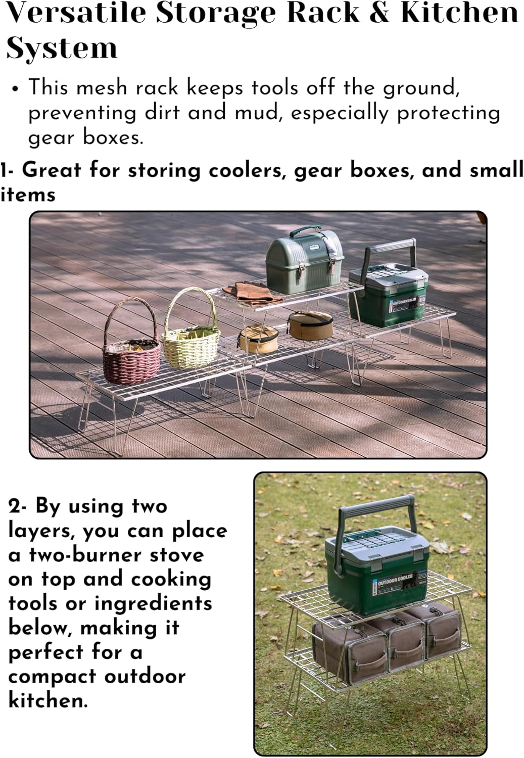- Chịu tải: Khoảng 66,1 lbs (30 kg) nhưng vui lòng không sử dụng bếp củi hoặc nồi bằng gang. Vui lòng sử dụng sản phẩm này sau khi quan sát tải trọng tối đa.) 【Cấu trúc gấp gọn nhỏ gọn】Gấp gọn chỉ còn khoảng 2,5 cm, tiết kiệm không gian trong xe hơi hoặc nhà ở. 【Tiết kiệm không gian & Di động】Thiết kế mỏng cho phép cất giữ hiệu quả và giảm thiểu việc chiếm dụng cốp xe. 【Khuyến nghị xếp chồng an toàn】Hoặc sử dụng nhiều tầng, nên dùng đai cố định do khung mỏng.