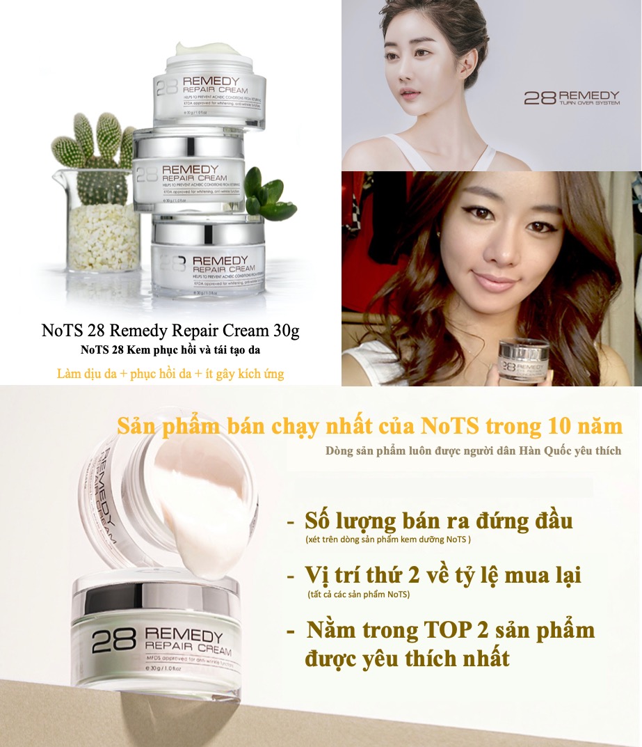 Kem dưỡng đặc trị NoTS 28 Remedy Repair Cream ứng dụng công nghệ mới với chiết xuất cây xương rồng giàu chất Aquaporin có tác dụng cung cấp độ ẩm tối ưu và làm mát da