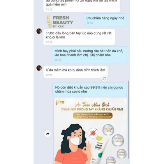 Ngoài ra, nhờ chức năng kháng khuẩn nên kem dưỡng da tay Pime còn dùng được với các làn da tay bị mẩn ngứa hay viêm da cơ địa Sản phẩm nhập khẩu chính hãng từ Hàn Quốc và được Bộ Y Tế cấp phép lưu hành. Fresh Beauty by K&K ra đời với sứ mệnh là kênh phân phối chính thức những dòng sản phẩm chăm sóc sắc đẹp, sức khỏe có nguồn gốc thiên nhiên, xuất xứ rõ ràng, chất lượng nhất từ Nhật Bản, Hàn Quốc và các quốc gia khác