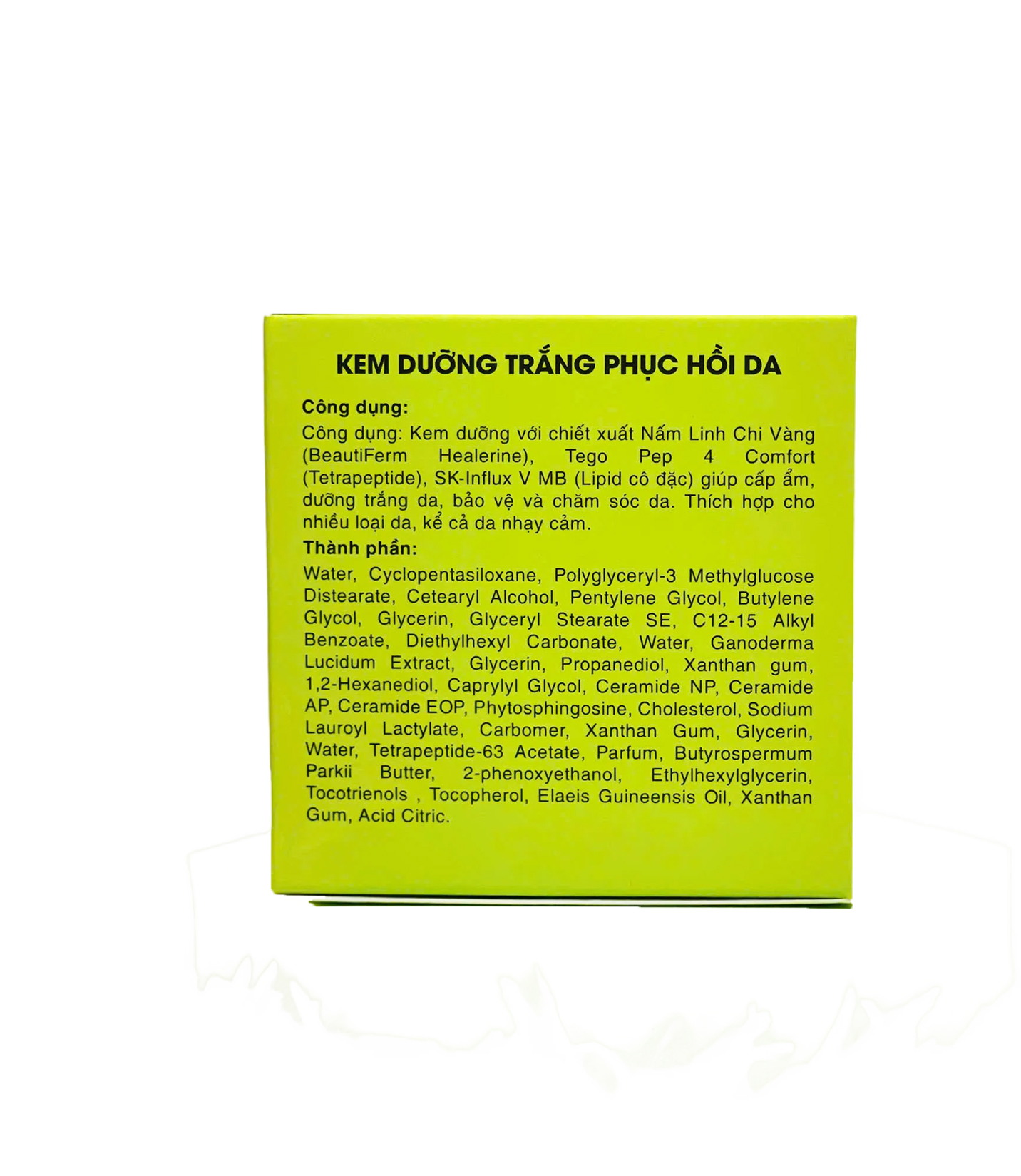 Công dụng: Kem dưỡng với chiết xuất Nấm Linh Chi Vàng (BeautiFerm Healerine), Tego Pep 4 Comfort (Tetrapeptide), SK-Influx V MB (Lipid cô đặc) giúp cấp ẩm, dưỡng trắng da, bảo vệ và chăm sóc