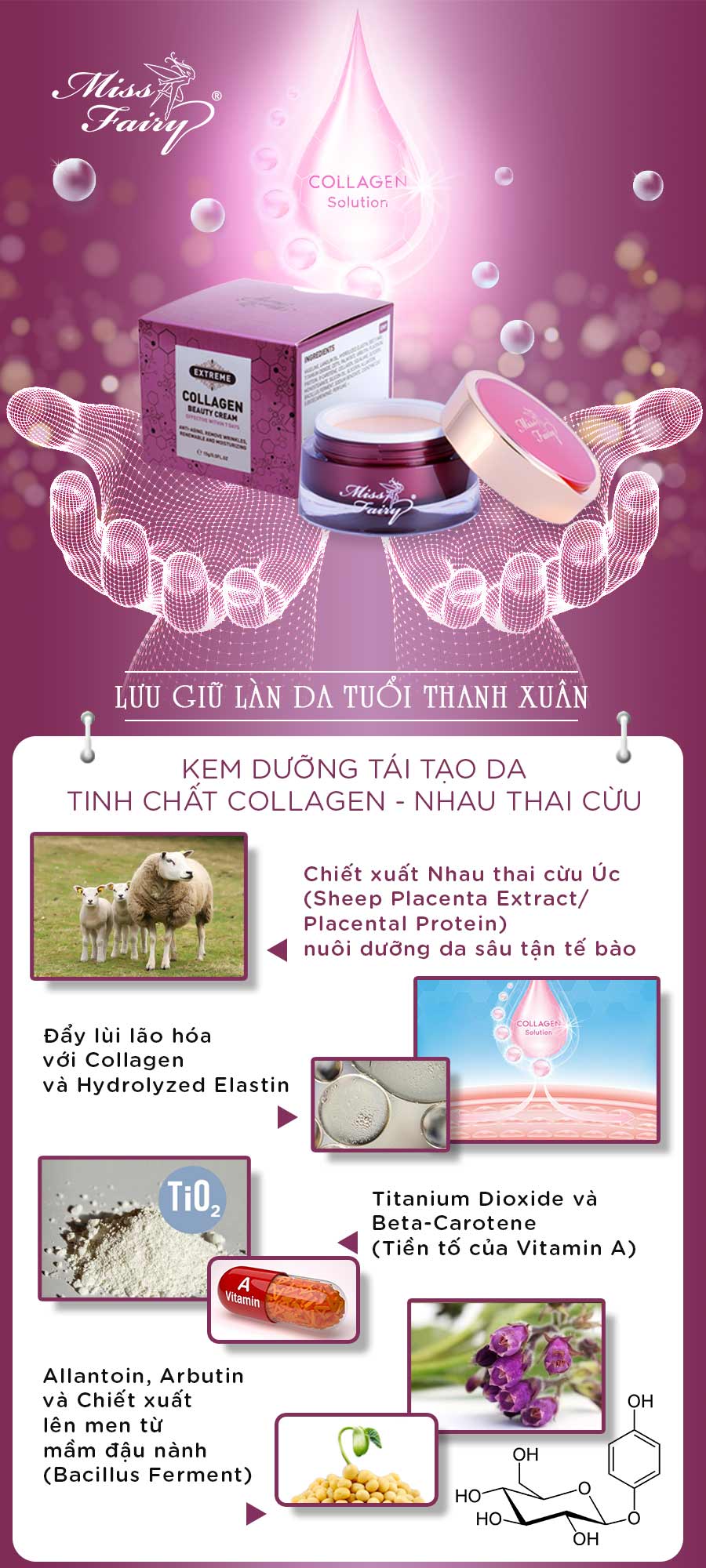 Kem dưỡng Tái tạo da Tinh chất Collagen Nhau thai Cừu Miss Fairy chiết xuất nhau thai cừu và tinh chất Collagen cao cấp loại bỏ các dấu hiệu tuổi tác và nếp nhăn, cho làn da sáng mịn tràn đầy sức sống.
